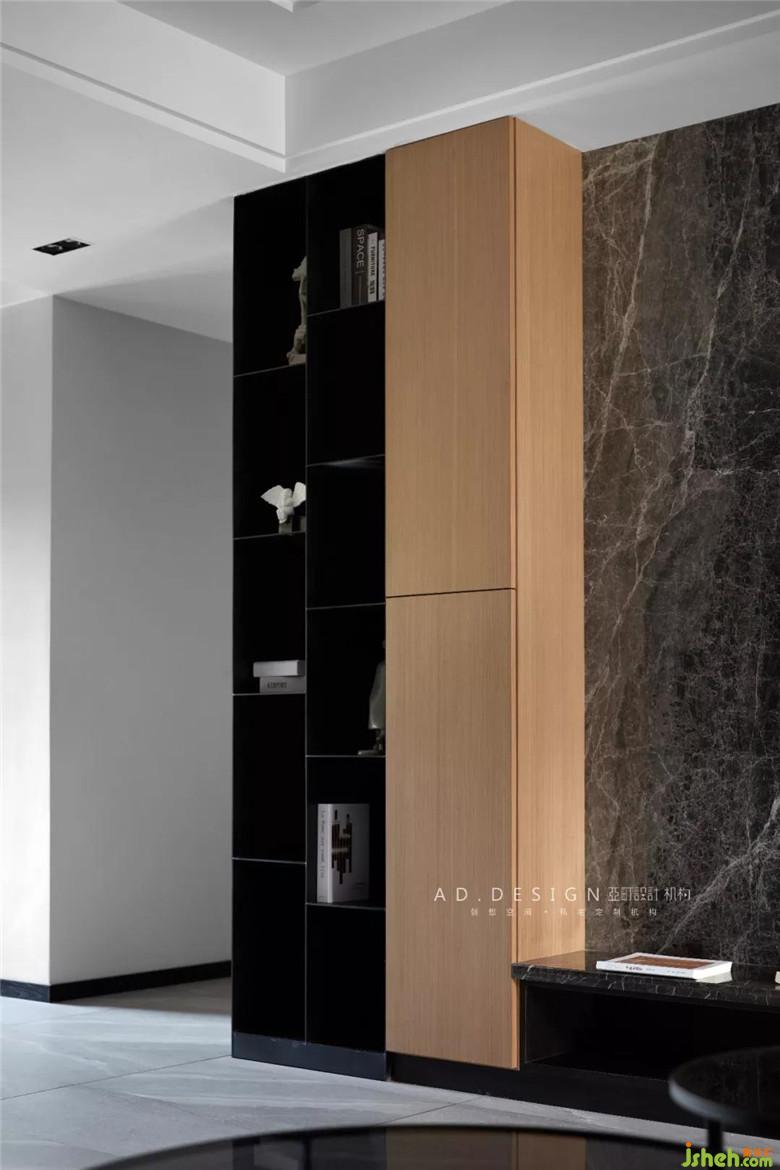 ▲裸露鋼板柜搭配木飾面柜門,將配電箱巧妙隱藏至柜內(nèi)。
