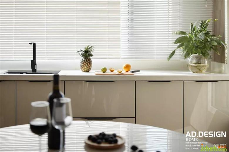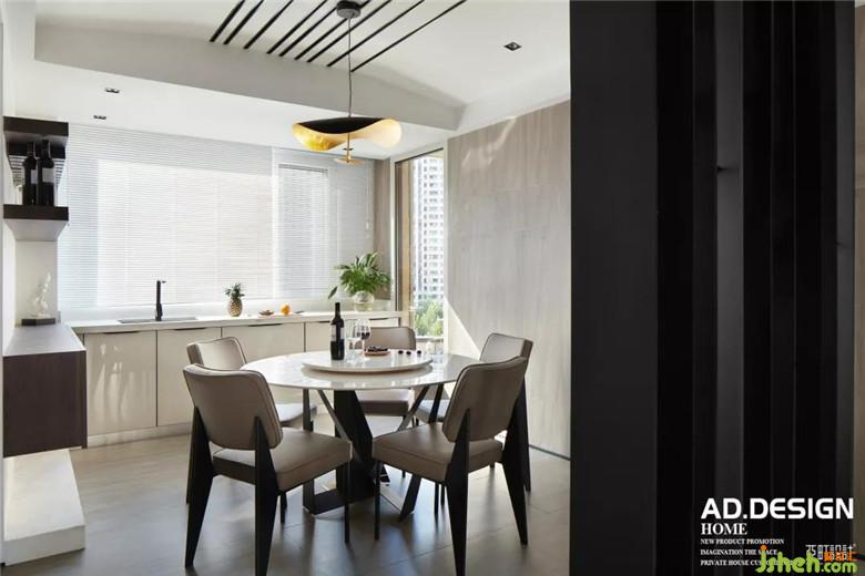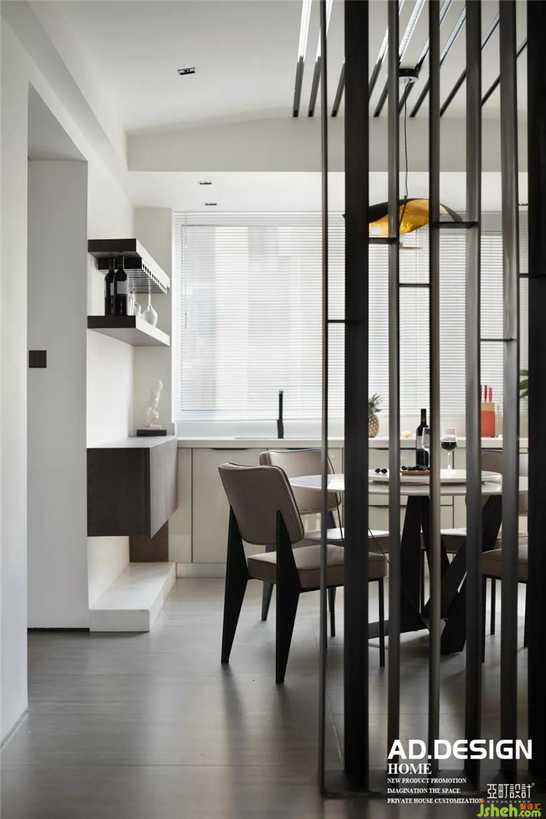 鋼板隔斷鱗次櫛比的佇立在餐廳中央,頂面的不銹鋼線條與其自然銜接,L型流線在整個(gè)餐廳里自然而然的舒展。白色玻璃櫥柜、灰色磨砂磚墻面交錯(cuò)組合的鋪設(shè),豐富了整個(gè)空間的層次感。