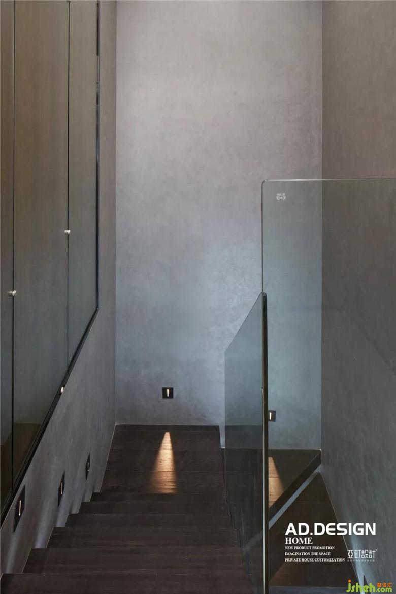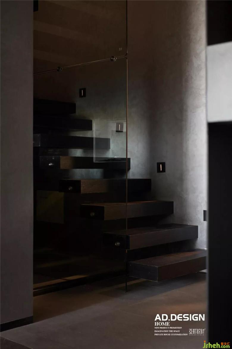 位于入戶右側(cè)的玻璃扶手與現(xiàn)場制作而成的黑色挑板式樓梯極具現(xiàn)代感。