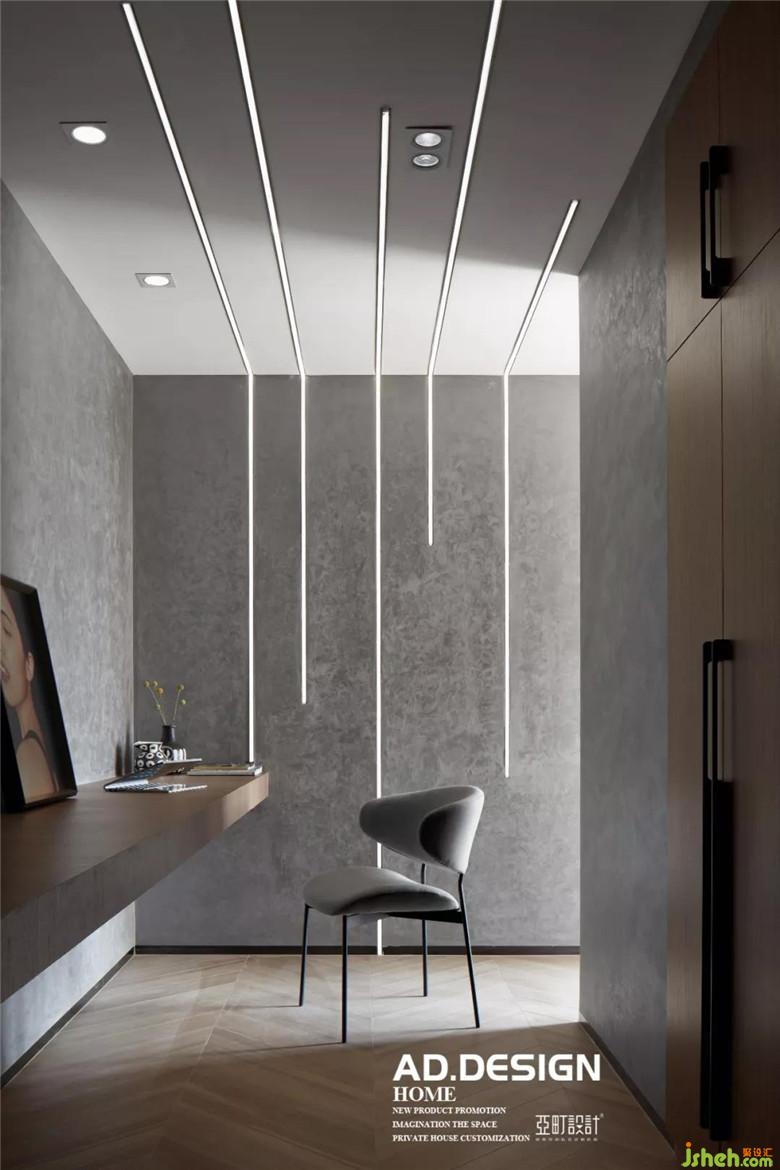 二樓迎面是最受業(yè)主喜歡的游戲室,超長的書桌充分滿足業(yè)主想要兩人同時在此玩游戲的訴求,甚至在有朋友到訪時能組團來個“開黑”。裝修公司從墻到頂?shù)木€型燈的設(shè)計更渲染出極具個性的空間活力,形成屬于此空間獨特的光美學(xué)。