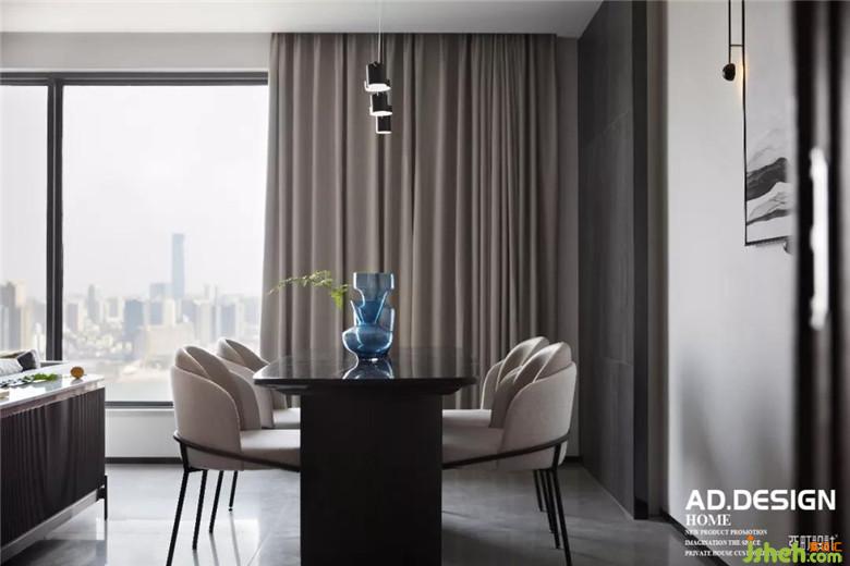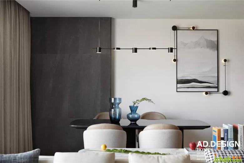 客餐廳整體的空間體驗(yàn)從頂面內(nèi)嵌的黑色燈具做區(qū)分,既是一體,又各自分離,餐廳區(qū)域墻面的留白給到大幅掛畫(huà)的空間,裝修公司配合壁燈燈光的映射,讓空間變得更加靈動(dòng)。