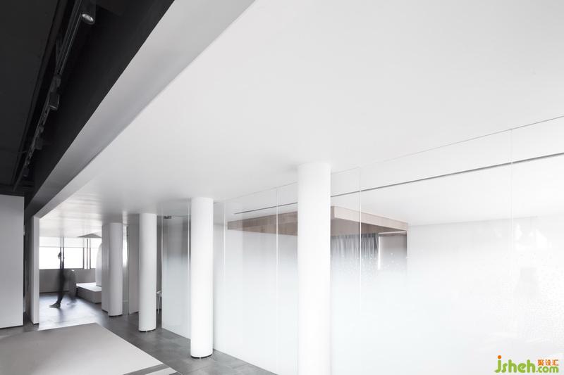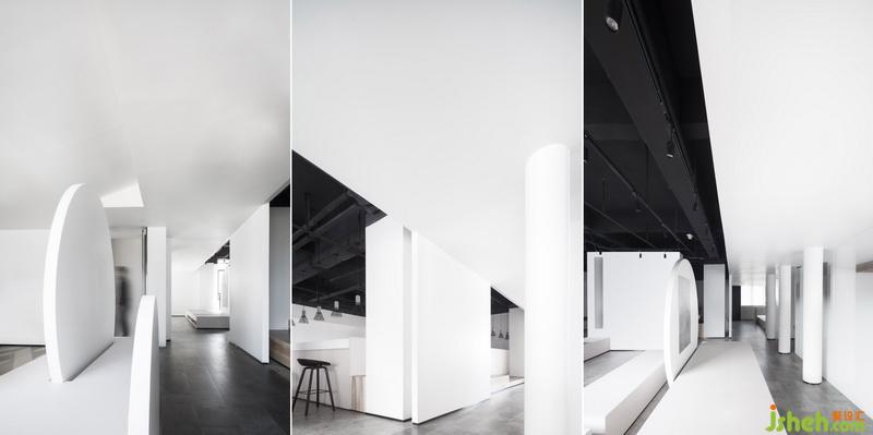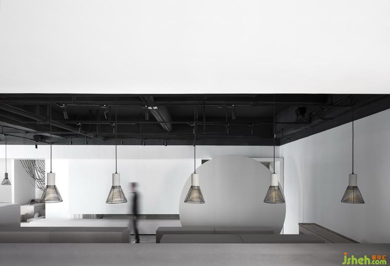 羅丹說,“塑造的時(shí)候,千萬不要在平面上,而是要在起伏上思考?!痹?50平米的展示空間內(nèi),楊氏以雕塑的筆法來塑造。射線、圓柱、方體構(gòu)成了立體的錯(cuò)層空間,讓工作區(qū)、辦公區(qū)、展覽區(qū)、多功能區(qū)既各自獨(dú)立又互為補(bǔ)充。多功能區(qū)以梯級(jí)的形式呈現(xiàn),活化了展覽空間的功能屬性。它既可以是大講堂,也可以是以產(chǎn)品的藝術(shù)創(chuàng)作過程為主體的視覺展或是與生活美學(xué)相關(guān)的美物展覽……如此,展覽陳設(shè)區(qū)變得愈加多元,實(shí)現(xiàn)了碩瀚創(chuàng)研希望創(chuàng)造不一樣的展覽體驗(yàn)效果的初衷,讓空間設(shè)計(jì)始終回歸到展覽空間的本質(zhì),達(dá)到最大化的共享,激發(fā)出富有彈性的全新展覽型態(tài)。