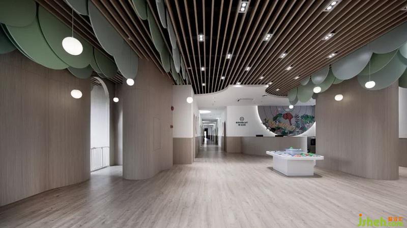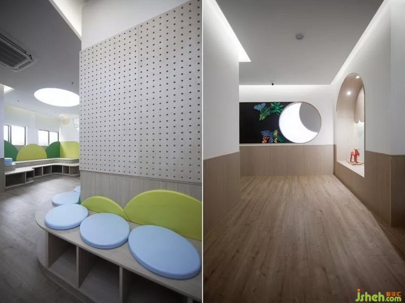 在其他空間的設(shè)計上同樣延續(xù)圓形的形狀去探索與孩子們的交流,希望能夠讓孩子們更快地去融入到這個空間里面;營造出像孩子們自己的家同樣的親切愉悅感受。在課室的墻上把教學(xué)黑板通過簡煉的幾何圖形設(shè)計,拉近空間環(huán)境與孩子們的心理距離。
