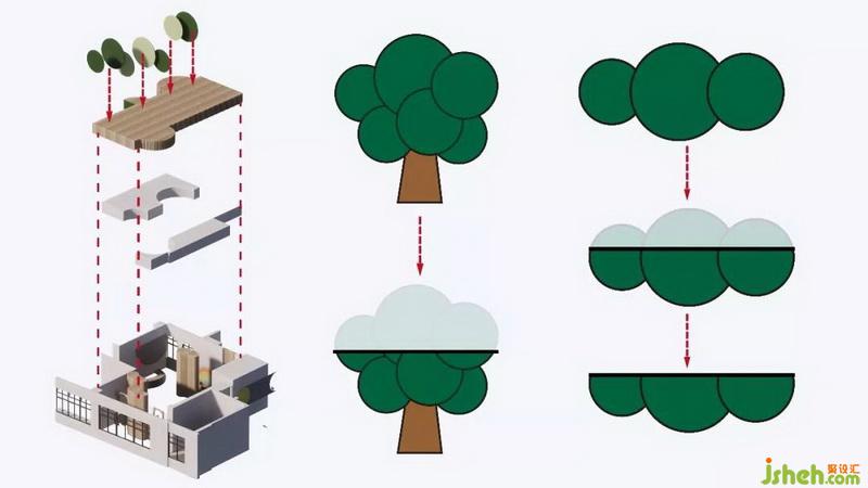 圓的元素在空間中的表達(dá),比其他的圖形都更加有意義。學(xué)者伊麗莎白·闊特對肯尼亞兒童和成人的研究,因格瑞德和斯文安德森對納米比亞黑巴部落成員的研究,都證實(shí)了這個觀點(diǎn)。兒童涂鴉期出現(xiàn)的圓形,往往被賦予了“人”的意義。孩子“最初畫出的真正表征性的形狀就是圓形和橢圓形”?!耙?yàn)閳A形的簡潔和完美,人的視知覺就會把它挑選出來,對它產(chǎn)生偏好”。設(shè)計師把大樹的元素抽象簡化后,提取圓形幾何圖形,為營造參天大樹的視覺感受,特意把圓形截取部分融入在天花里面,以小孩的視覺感受出發(fā),只看到大樹的下半部分,形成猶如幾棵參天大樹聳立云霄的視覺感受。