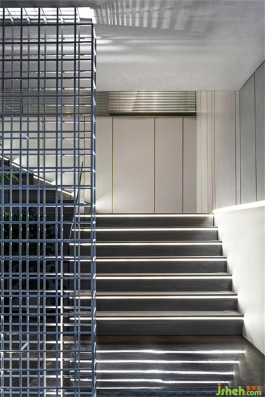 事務所設計將玻璃覆蓋樓梯側(cè)保障安全性的同時也可以將木踏面的精致和諧之美傳遞到公共空間中,自然綠色植物設計在樓梯邊的空間延伸到二樓,增加空間的通透性,同時打破自然與空間的界限。