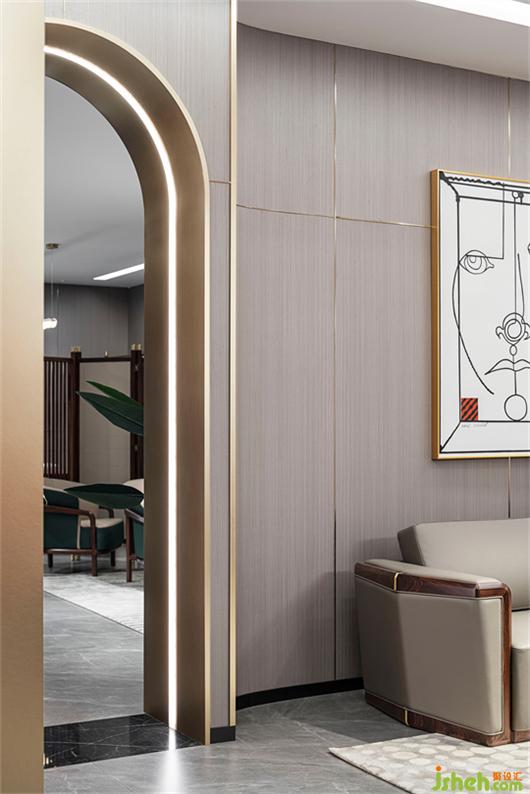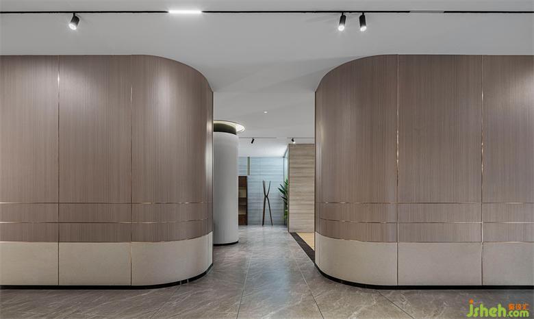 當(dāng)空間被劃分為不同功能空間時(shí),需要用一個(gè)支點(diǎn)將空間各區(qū)凝聚起來(lái)。每個(gè)區(qū)域都有弧形造型來(lái)連貫,既貫穿各展示區(qū)域引導(dǎo)視覺(jué)動(dòng)線,也以概念化手法呈現(xiàn)項(xiàng)目的核心理念。
