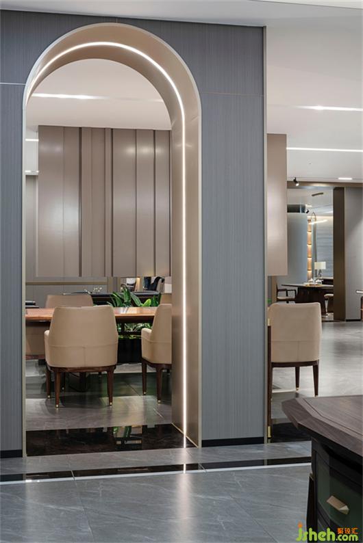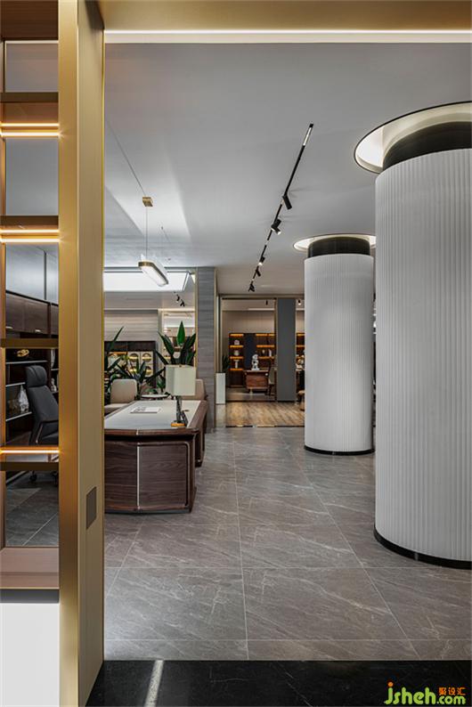 展示區(qū)的產(chǎn)品分布在每個(gè)造型區(qū)域,區(qū)域中沒(méi)有過(guò)多的配飾,用空間放大產(chǎn)品的感受力。家具展廳設(shè)計(jì)在展廳的末端,為企業(yè)自用的辦公室及休閑娛樂(lè)空間,開(kāi)放式的辦公設(shè)計(jì),讓來(lái)賓更能感受自由辦公概念。
