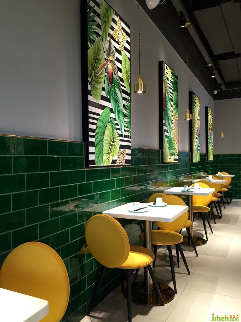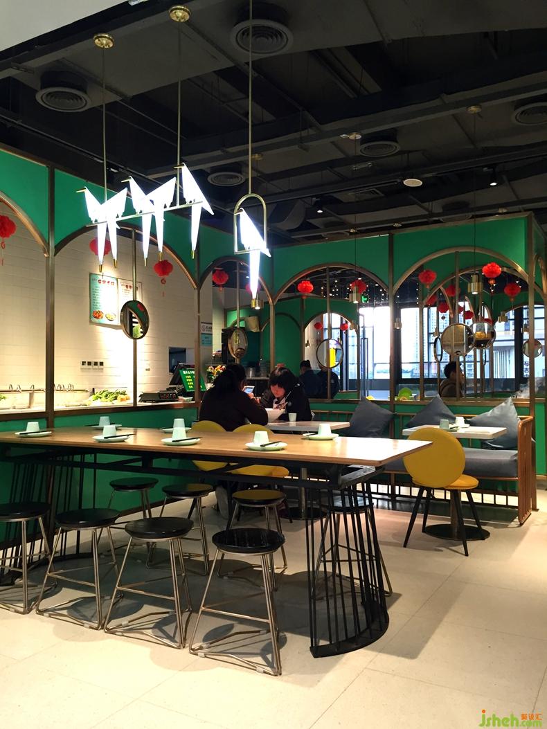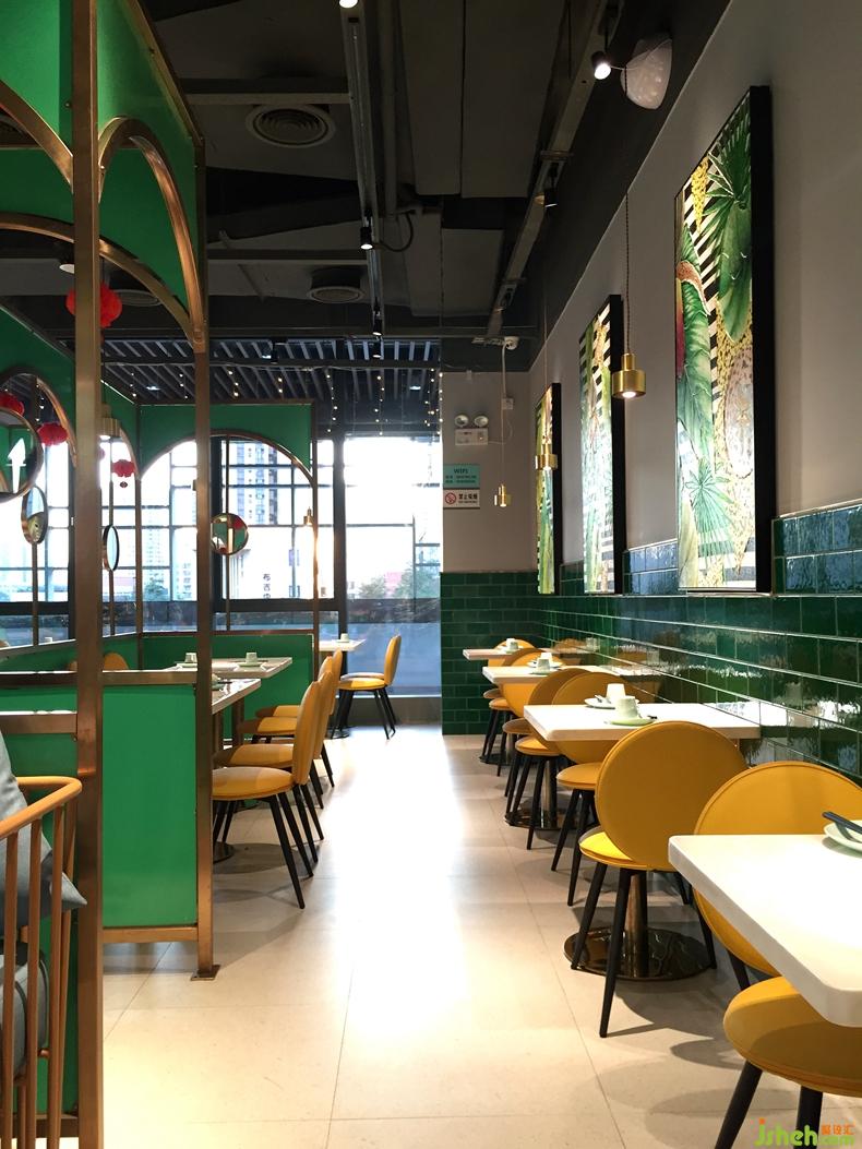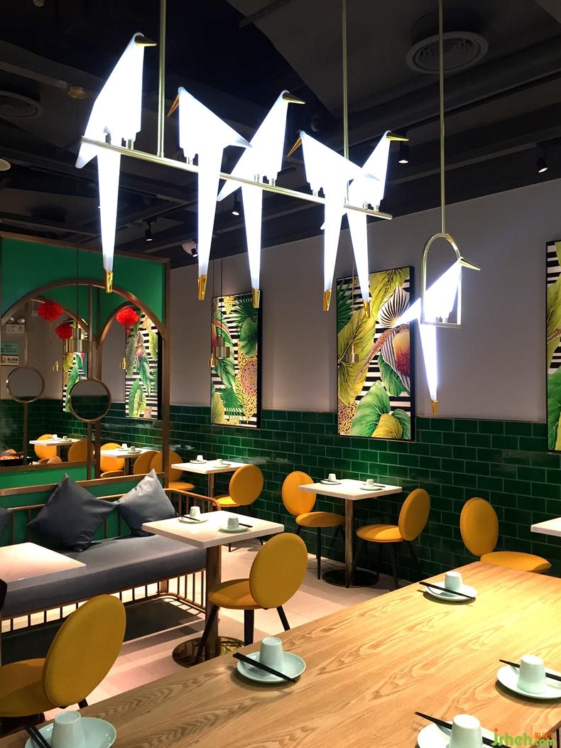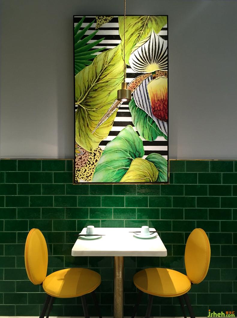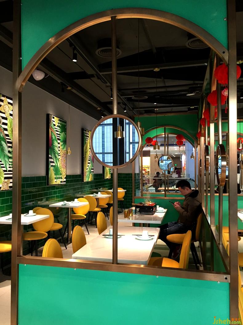 深圳,餐飲競爭激烈的今天,各大餐飲品牌進(jìn)駐購物中心已然成為屹立于城市軸心地帶的當(dāng)代人生活地標(biāo)。新時代消費群體對于一座城市的認(rèn)知,早已從同質(zhì)化的購物綜合體轉(zhuǎn)變成由藝術(shù)家、設(shè)計師或商業(yè)品牌所帶來的獨特體驗。此次,餐廳坐落于布吉繁華的商業(yè)中心,作為知名連鎖品牌魔鍋坊麻辣香鍋的形象升級旗艦店,一品創(chuàng)意設(shè)計為其定制設(shè)計了一個極具顛覆性和自然清新的主題空間,以張揚和獨特的手法重新表達(dá)魔鍋坊品牌內(nèi)涵。面積不大,但是設(shè)計師在平面的處理卻花了許多心思, 入口,八人的長桌既能滿足年輕人聚會需求,同時跟其他區(qū)域形成區(qū)分,千紙鶴的吊燈成了空間的一大亮點,營造了區(qū)域感。隔斷的做法打破常規(guī)的直通到頂,中間的大面積鏤空讓空間既有區(qū)分又有聯(lián)系 ,豐富了空間的層次,高低錯落的鏡子讓隔斷更顯趣味性,色調(diào)的設(shè)計上,麻辣香鍋作為口味較重的菜系,給客戶的印象是暗色調(diào),或紅或黑,設(shè)計師打破了這一常規(guī),采用綠色結(jié)合精致的金色作為點綴。靠墻的一排座位,墨綠色的陶瓷磚延續(xù)空間的綠色調(diào),墻上的掛畫客戶花了高價格請藝術(shù)家定制的油畫,讓綠意清新的空間增加了幾分自然氣息,黃色的馬卡龍椅子與整個空間形成強烈的對比,讓整個空間眼前一亮,以致于路過的客人都會忍住不進(jìn)店參觀.帶著好奇,參觀者意欲探索室內(nèi)每一處空間,讓空間的價值也得以實現(xiàn)最大化。餐廳設(shè)計