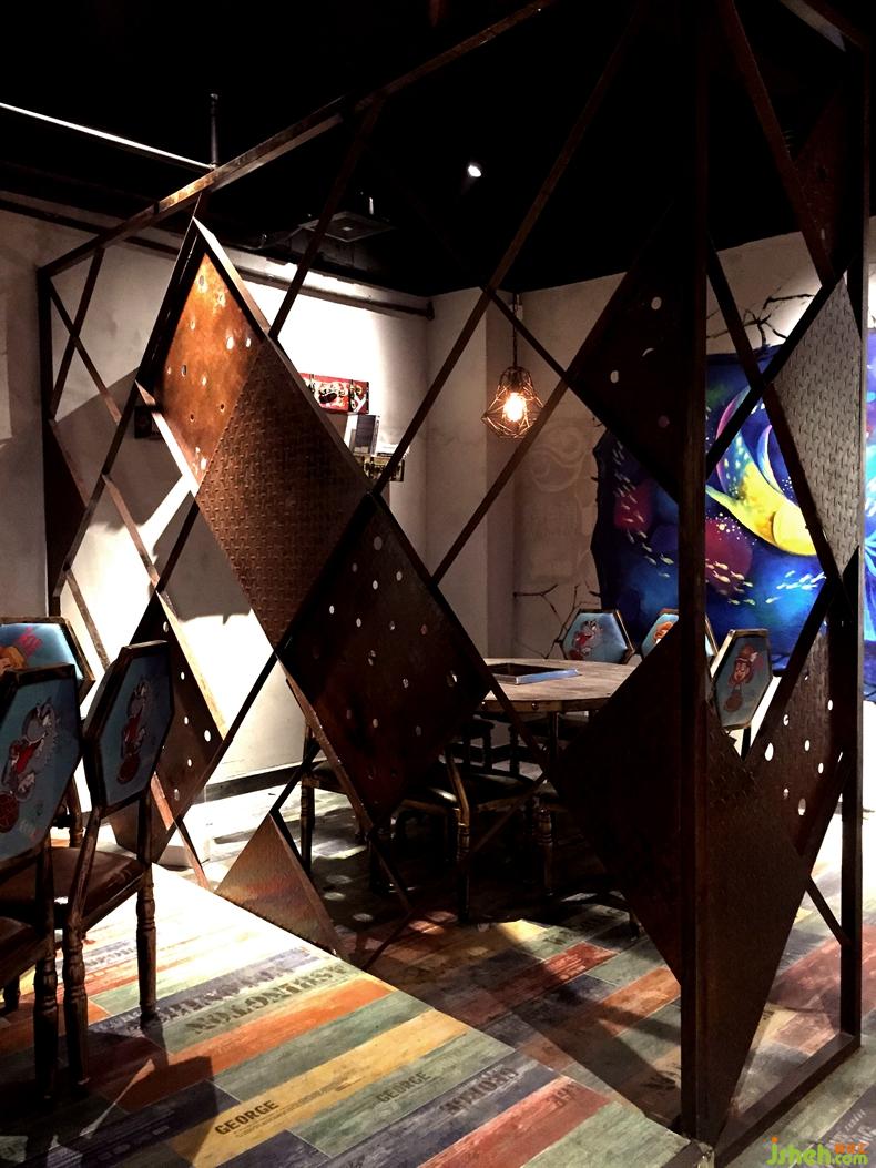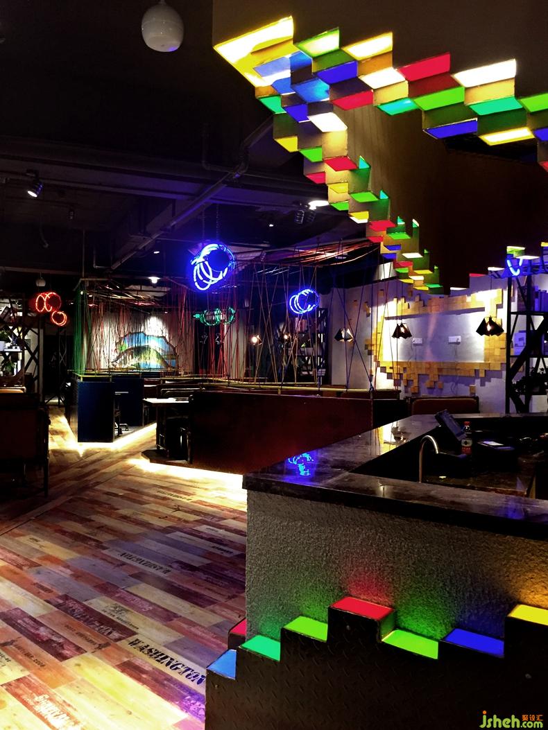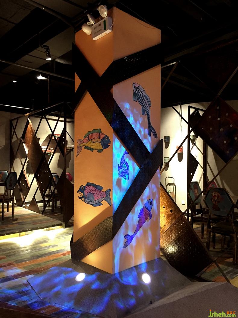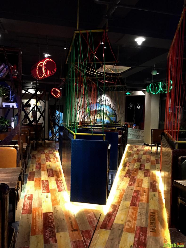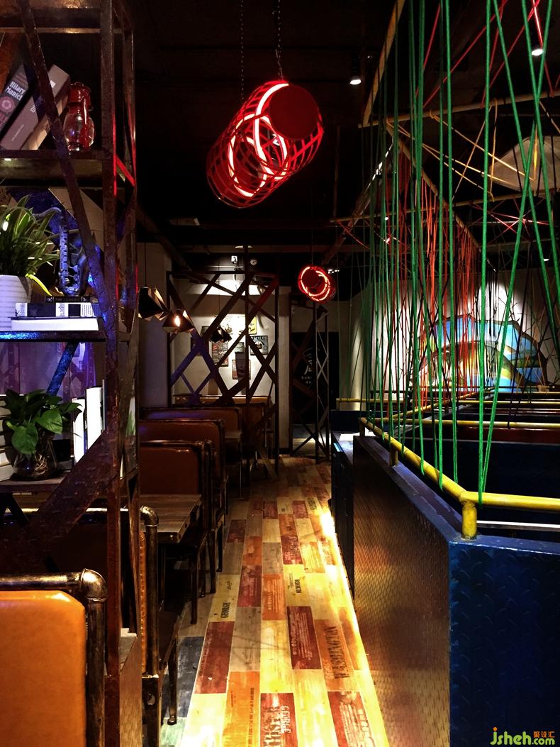 一群充滿生機(jī)和活力的80后老板,為深圳的年輕人提供熱情洋溢社交空間以及味覺(jué)體驗(yàn)。同時(shí)也是深圳第一家引入了魚(yú)頭火鍋。設(shè)計(jì)師在表現(xiàn)餐廳定位的過(guò)程中打破常規(guī)思維,平面圖上選擇的不規(guī)則的構(gòu)圖方式。引用了最原始元素小漁船的銹色鐵板,將顧客帶回到了最原始的小漁船上,一天的疲憊將全部放下,享受當(dāng)下跟朋友的暢談與味蕾的體驗(yàn)。在空間的分區(qū)設(shè)計(jì)師特意抬高了水平面,給予顧客上島的心理暗示,同時(shí)也是希望在心理上幫助客戶忘記疲憊,好好享受不一樣的空間。同時(shí)空間大量使用了色彩斑斕的酒吧燈光,愈營(yíng)造放松活躍,解放天性的年輕人的氛圍。在空間無(wú)處不在的可以感受在島嶼的氛圍,如使用的彩色的編織線愈喻漁網(wǎng)進(jìn)行空間的區(qū)分,活靈活現(xiàn)的游魚(yú)裝飾。設(shè)計(jì)師的一切設(shè)計(jì)回歸關(guān)注到升華餐廳主題以及顧客的需求。餐廳設(shè)計(jì)