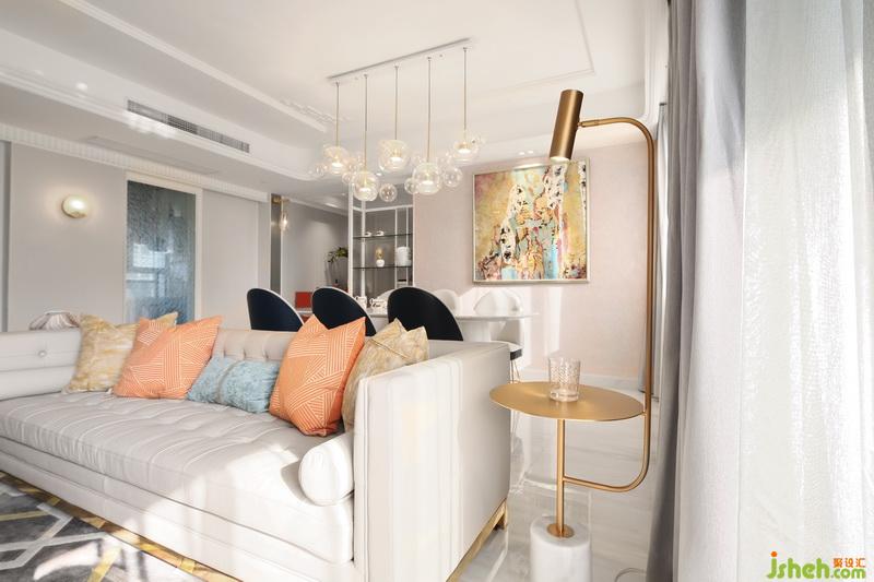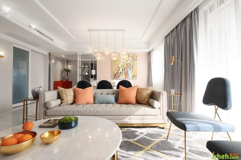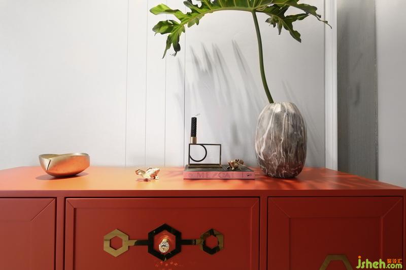 家具的造型充滿藝術氣息,滿足了實用的同時亦為居住者的日常增添情趣和靈感。設計公司在色彩配搭上,也有考究,過道的邊柜選用了高級的橘紅色,個性鮮明且有格調,一個相對較暗的角落處理讓人驚喜。抱枕和掛畫與背景墻的Pale Dogwood相得益彰!最后,有幾何圖案的淺灰色地毯跟窗簾則讓視覺回歸平靜,色彩有度不至于過分喧鬧。