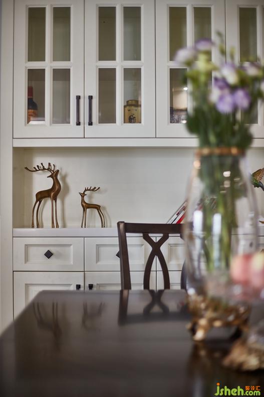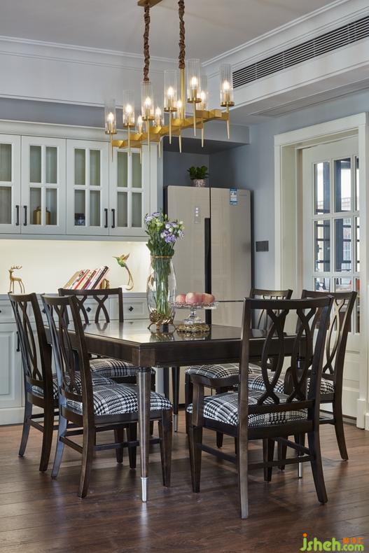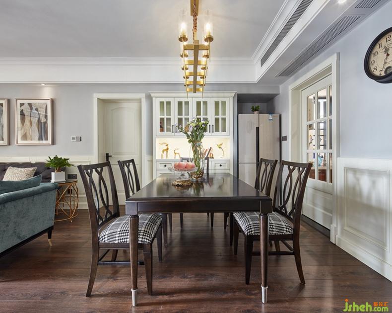 餐廳與客廳一體化的設(shè)計(jì)使得整個(gè)空間更為明亮。作為用餐區(qū)的餐廳,在保證基本用餐需求之時(shí),還能滿足主人的精神需求,金屬裝飾物和掛畫(huà)起到了點(diǎn)綴的作用。