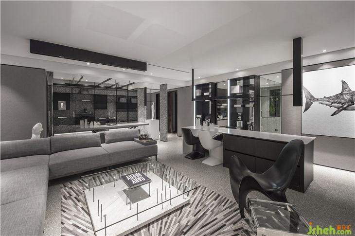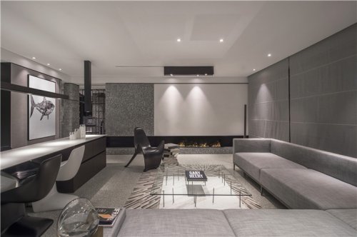 皮草與金屬的混搭,仿佛是一場紳士的游戲,客廳空間的地毯皮草上的肌理與天花上的線性圖案,站在世界的兩端對話。