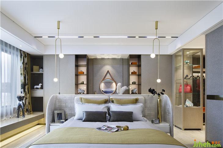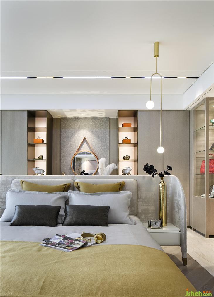 居中而放置的床,打破傳統(tǒng)臥室布局方式,自由地包裹設(shè)計(jì),給人以溫暖踏實(shí)。梳妝臺(tái)藏在床的背后,悄悄地?fù)纹鹆艘环阶兠赖奈枧_(tái),起床后華麗轉(zhuǎn)身,梳妝打扮。