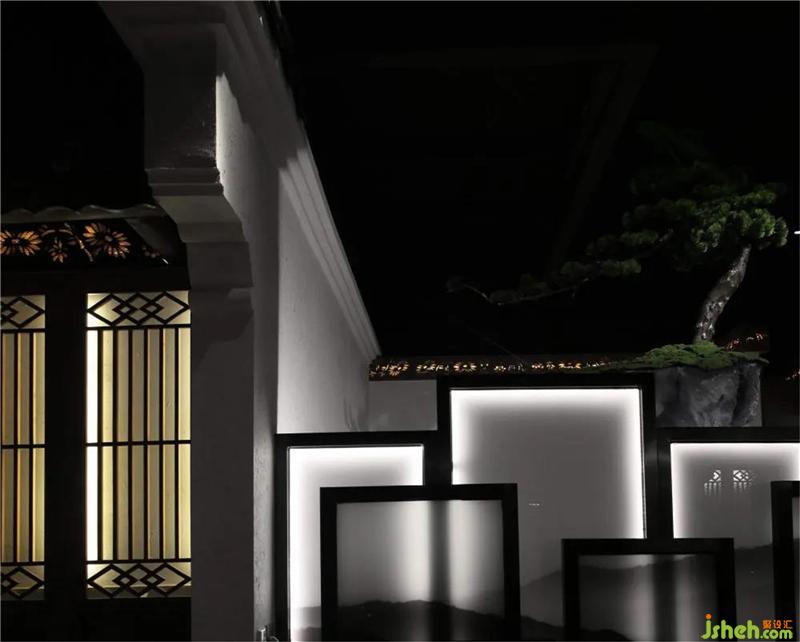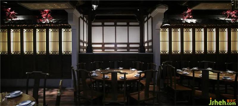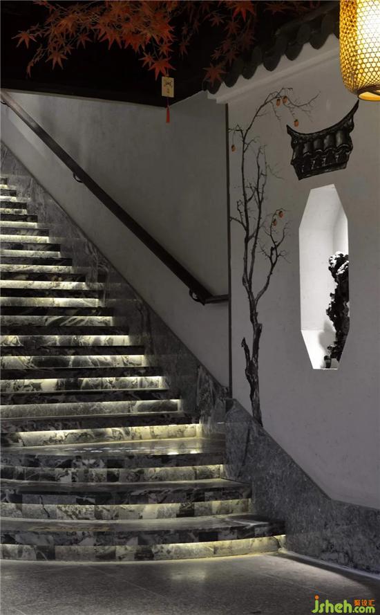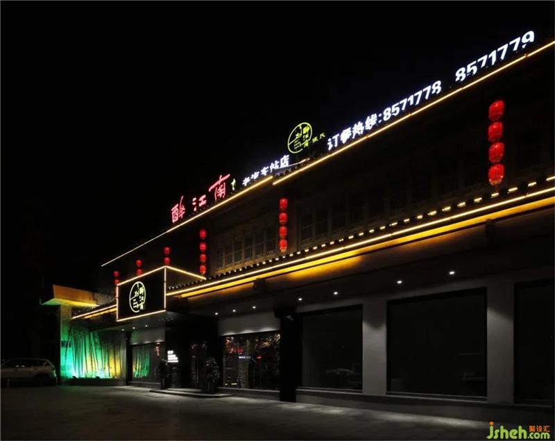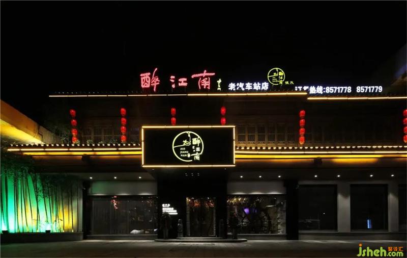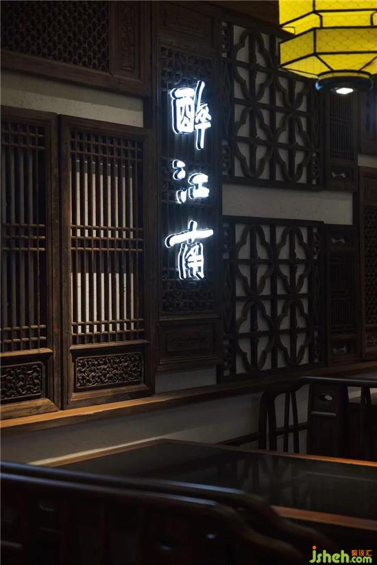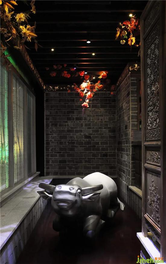 醉江南位于九江市潯陽區(qū)原老汽車站前,隸屬老城中心區(qū)域這是一個(gè)二層建筑的改造,設(shè)計(jì)上取“江南”之意,著重體現(xiàn)中式建筑結(jié)構(gòu),將整體的用餐環(huán)境帶入江南的樓閣之中?!皹情w宜佳客”——南方建筑因氣候炎熱潮濕,所以一般以二層樓房居多,底層是磚結(jié)構(gòu),上層是木結(jié)構(gòu)。此次門頭的設(shè)計(jì),便是借鑒了這一特點(diǎn),一樓以外墻漆搭配石材及黑色不銹鋼,帶有寶瓶造型的玻璃門加上外墻大面積的玻璃設(shè)計(jì),即使站在門外也可以感受到餐廳的氣氛;二樓便是用木結(jié)構(gòu)造型,營(yíng)造樓閣的氛圍,搭配窗外綠植更添色彩。推門而入,站在小橋之上,水牛臥在水中,聽著對(duì)面水車的聲響靜靜的遙望。透過紅楓樹望去,蓋瓦的屋棚,發(fā)光的牌匾,藍(lán)色的明檔墻磚,將這個(gè)空間跳脫出來?!耙怀且晃丁笔菍?duì)城市味道的寄寓,“三餐茶飯”是對(duì)家的渴望;門外的馬頭墻上運(yùn)用手繪和實(shí)物的結(jié)合,打造出鄰家的意境。拾級(jí)而上,玻璃磚搭建馬頭墻在虛實(shí)之間變換,中庭中間擺放著9個(gè)拴馬樁,名為“龍生九子”。江南多雨,屋瓦在建筑中既起了裝飾又有擋雨之用,設(shè)計(jì)中將此元素提出,并融入水景之中,低矮磚墻便體現(xiàn)屋檐延綿之感。云朵燈飄散于頂,對(duì)面的三個(gè)連亭的用餐區(qū),也與這延綿水景互相呼應(yīng)。宴會(huì)廳內(nèi)有一四角古亭,名曰陶然亭,另有樓中戲臺(tái),街邊小屋,馬頭墻做的墻面造型頂上編鐘吊燈,木制屋頂?shù)鯚簦l(fā)光的分色線條都增加整體空間的視覺和空間的延展。造一幕景,續(xù)一段回憶,去到江南,最難忘的或許不是湖光山色,而是那因緣而遇的煙雨饒山,自然之間的碰撞,躍然紙上的水墨美景,或許才是印象最深的。游江南,游的心還是景?醉江南,醉的是景還是心?餐廳設(shè)計(jì)