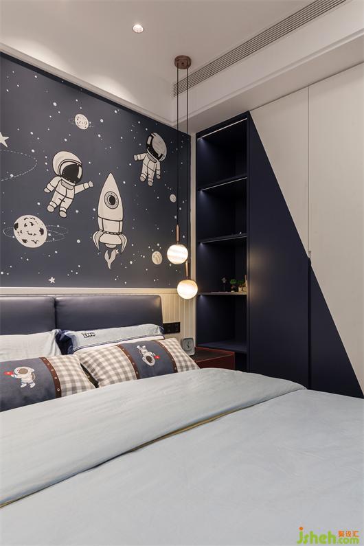臥室的設(shè)計(jì)更多的采用溫馨的材質(zhì)來體現(xiàn)空間,精美的木地板,極具質(zhì)感的硬包皮革,以及暖灰的墻板,細(xì)膩的藝術(shù)涂料,共同格勒臥室空間的格調(diào)。兒童房的設(shè)計(jì)以藍(lán)色和灰色為主,細(xì)膩的小山,給人無線遐想的太空?qǐng)D案,給孩子一個(gè)美麗健康的居住空間,快樂的成長(zhǎng)。