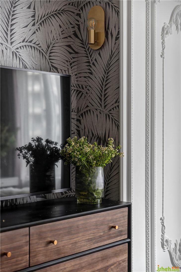 電視柜則內(nèi)置在與客廳連接的墻體中間,中間的壁紙則與我們沙發(fā)背景呼應(yīng),黃銅壁燈面對(duì)面裝飾,胡桃木色的電視柜,無(wú)一處不體現(xiàn)設(shè)計(jì)師的用心搭配。
