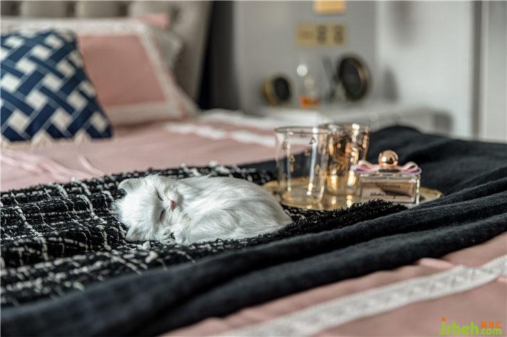 可愛的毛絨仿真貓咪懶懶的躺在床旗上。