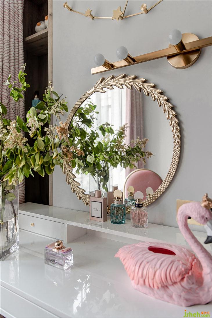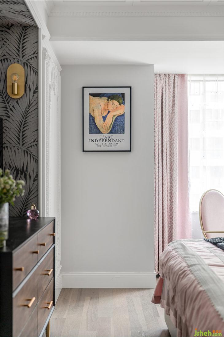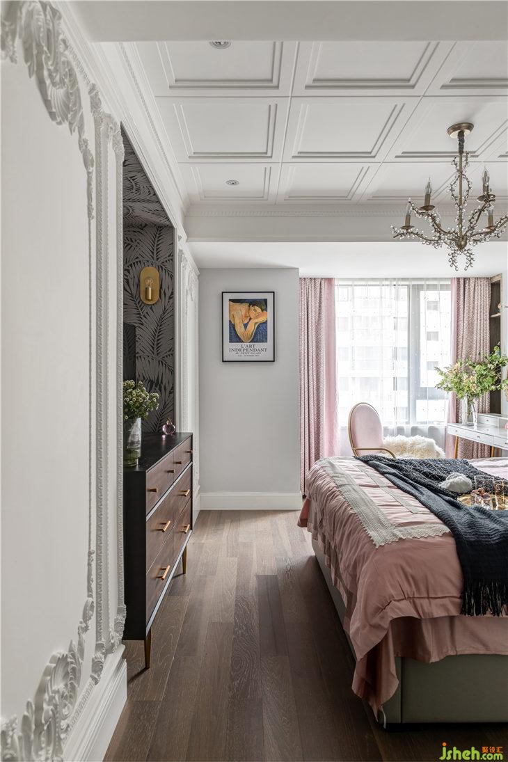 主臥室,初始的設(shè)計(jì)是明亮色系的,在后期的軟裝方案中,我們方向發(fā)生了轉(zhuǎn)變,也是想更貼合客廳的整體精致氛圍,女業(yè)主的心里一直有個(gè)公主夢(mèng),她喜歡粉色和blingbling質(zhì)感的飾品,所以我們后期混合了粉色系和金屬質(zhì)感的家具,復(fù)古水晶吊燈,吊頂?shù)陌纪汞B級(jí),則是融入了法式宮殿情懷,讓每個(gè)細(xì)節(jié)都精致有度的展現(xiàn)我們業(yè)主的喜好。