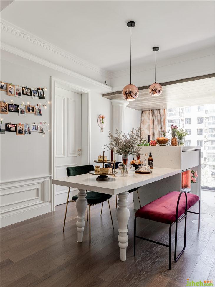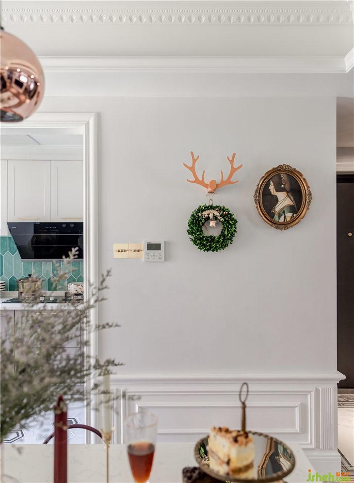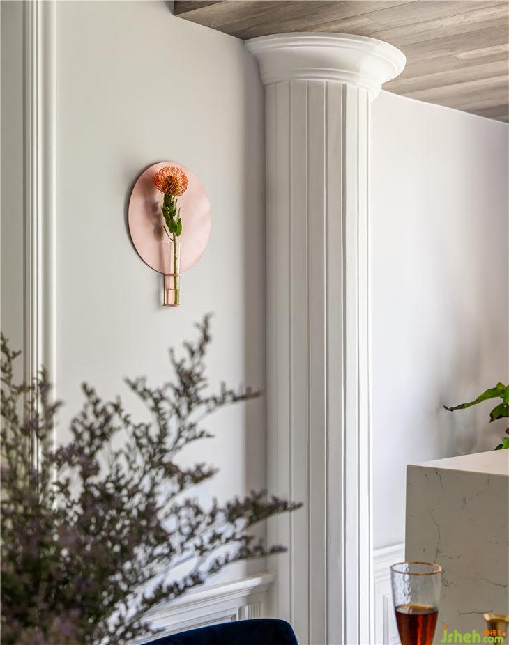 這里原本是有個北陽臺下水管,比較突兀,位置也不能改動,我們設計了羅馬柱的樣式來裝飾包裹,讓它成為了餐廳的一個小亮點。粉色圓盤與小花瓶結(jié)合的壁飾,用一株鮮花,就可以讓餐廳變得生機勃勃。