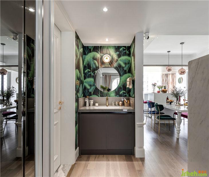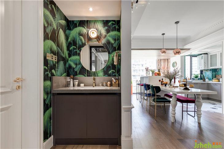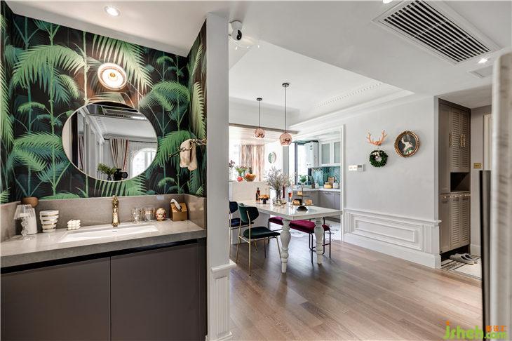 干區(qū)正好在客餐廳的中間過(guò)渡區(qū)域,我們將其融合到客餐廳里,選用了英國(guó)Cole&Son 進(jìn)口墻紙棕櫚樹(shù),型號(hào)是:墨綠色 95/1003。