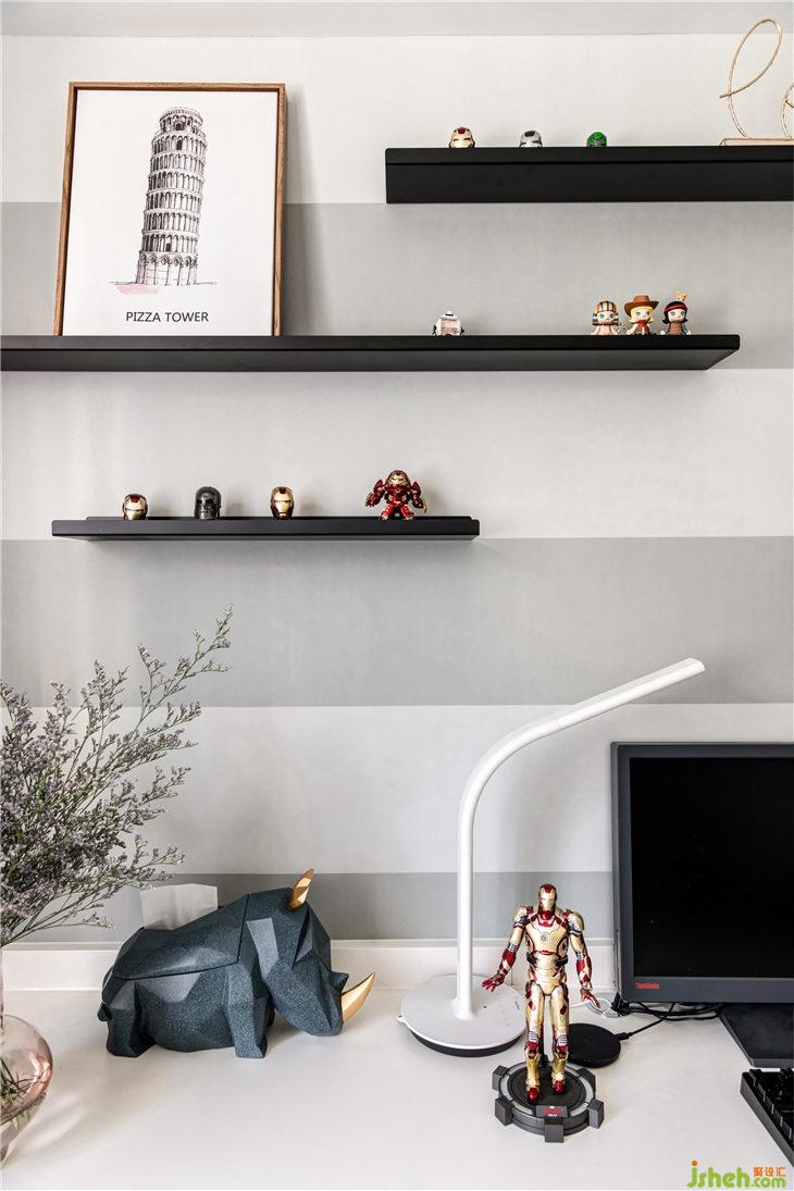 這里也是男主人的游戲娛樂(lè)室,業(yè)主喜歡游戲和收藏,設(shè)置了層次錯(cuò)落豐富的置物架,展示著這些可愛(ài)的小物件。