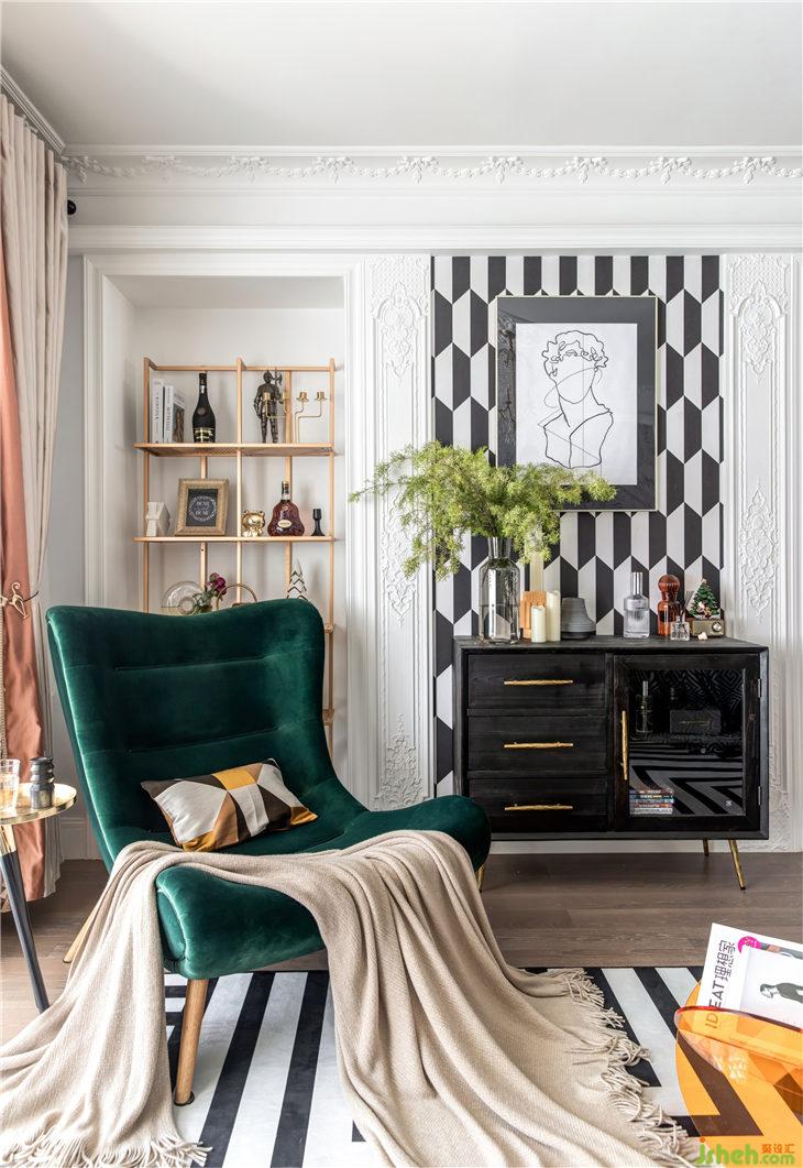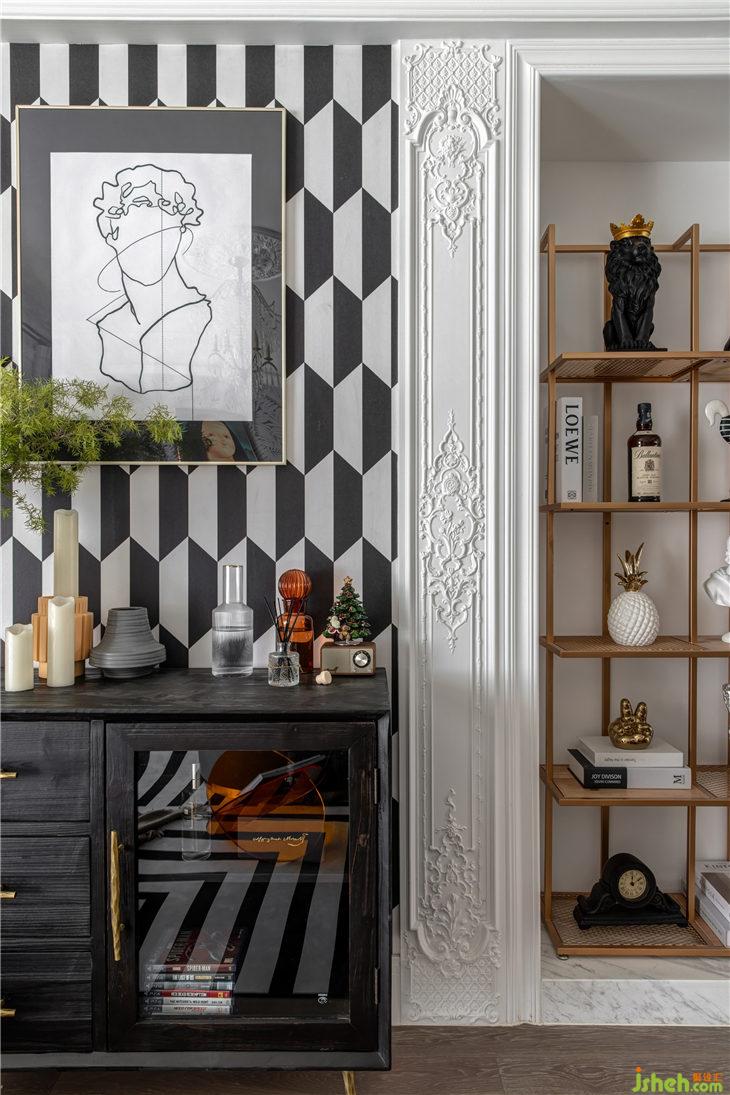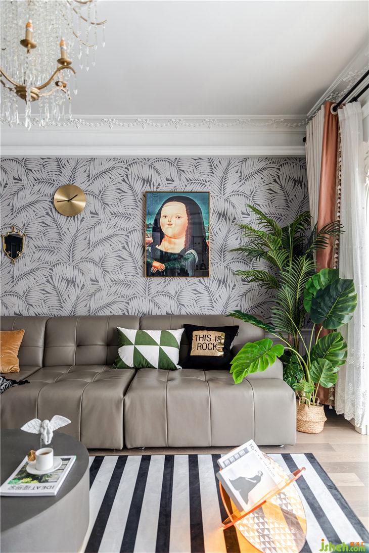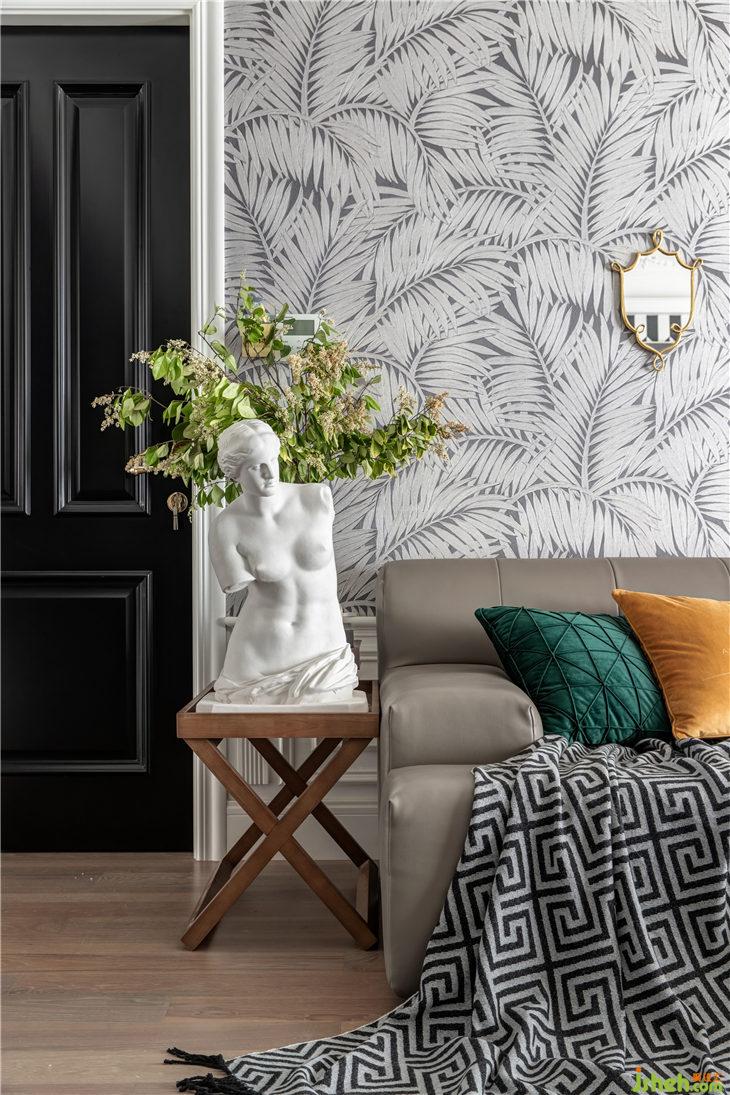 沙發(fā)背景是比利時(shí)ARTE 進(jìn)口墻紙壁紙, 型號是75207,凹凸有致的紋理,精美而又典雅。古典優(yōu)雅造型的銅鏡+現(xiàn)代極簡掛鐘,現(xiàn)代與古典的碰撞,彰顯了氣質(zhì)的完美統(tǒng)一。