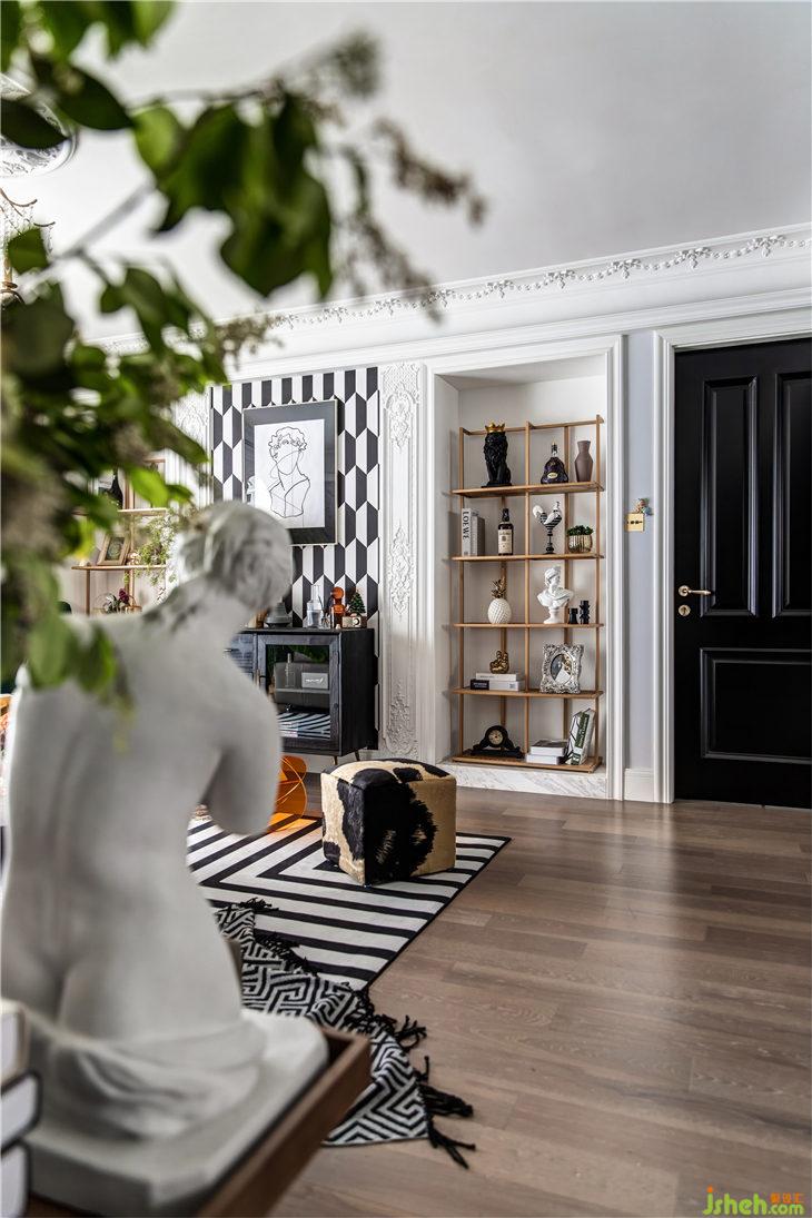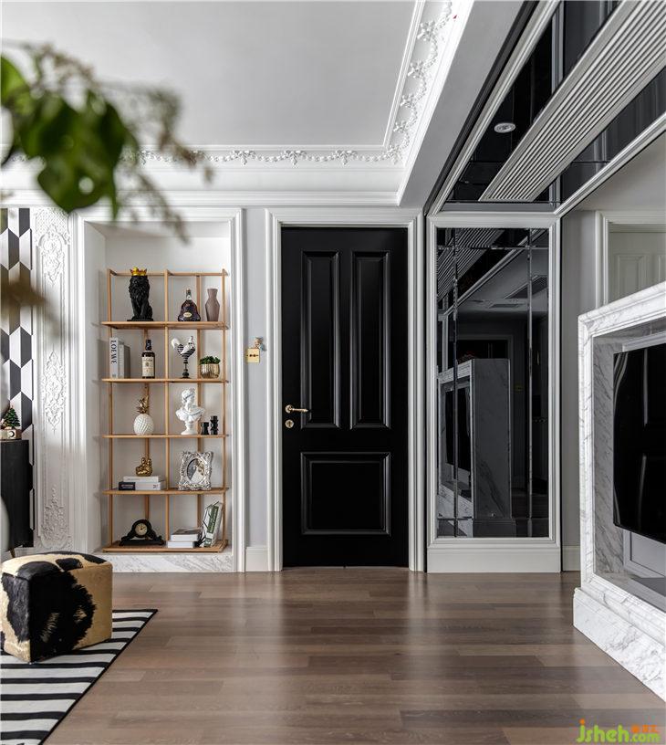 旋轉(zhuǎn)電視架上方正好是客餐廳放置空調(diào)的位置,利用寬門套結(jié)合車邊灰鏡效果進(jìn)行視覺拓展,讓原本客廳最低點(diǎn)的過道視野得到擴(kuò)展,定制長的整段白色出回風(fēng)口,比例完整貼合。同時(shí),這塊采用外黑100mm的大門套框內(nèi)套60mm長方形白色內(nèi)框組合,與客廳兩個臥室門的色彩搭配反差交融,整體統(tǒng)一又富有古典韻味的細(xì)節(jié),使這塊交接空間的層次進(jìn)行了氣質(zhì)上的升華。