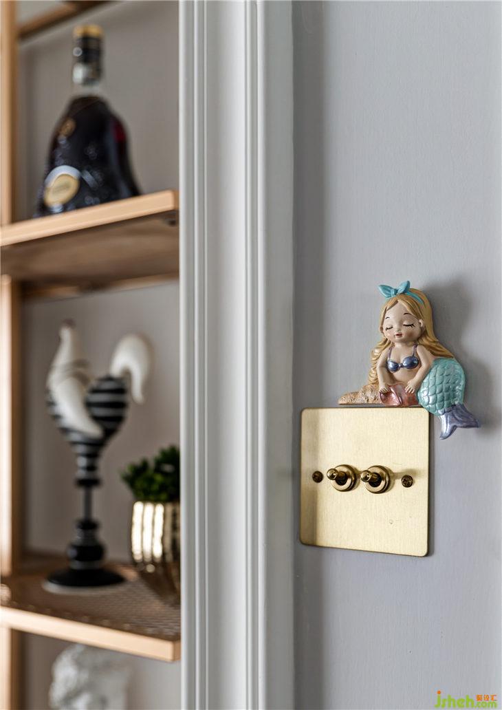 黃銅的開關面板上是我們業(yè)主自己購買的美人魚裝飾,每個造型都不一樣,安靜的呆在那里,就像家里多了幾個可愛的小精靈,生動又美麗。