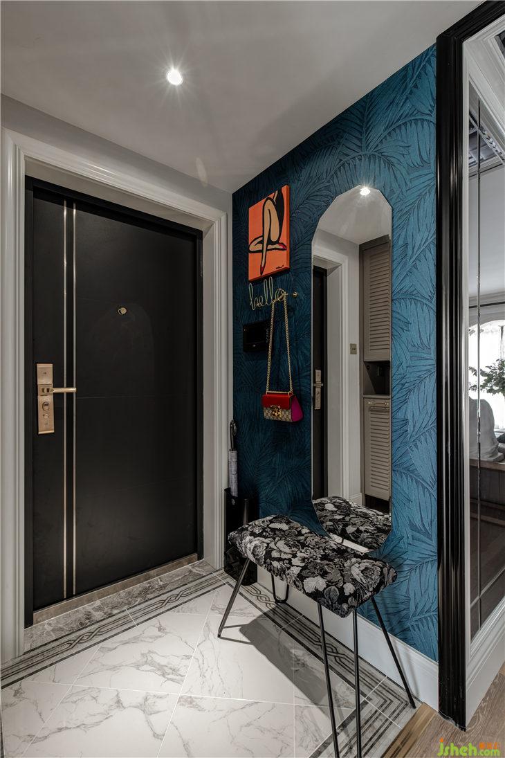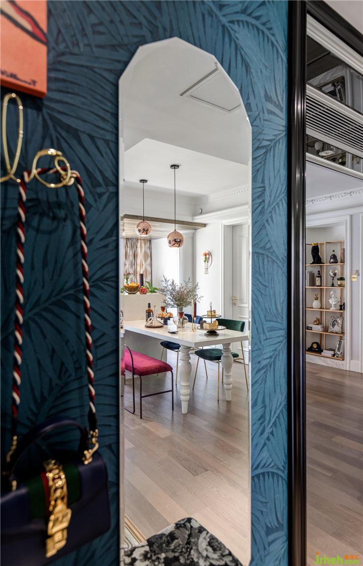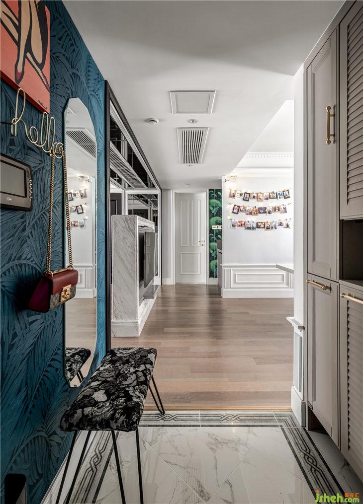 開門入戶,時尚混搭氣息撲面而來,左手邊是比利時arte進口墻紙,圖紋是熱帶雨林的葉子,深藍的靜謐與凹凸有致的紋理搭配時尚跳色掛畫,金色英文字母“hello”掛鉤,右邊棱角分明的全身鏡,地面是經(jīng)典法式花紋圍邊,右邊扣線門板加百葉門板的組合配上精致復古的把手,野獸派獨特花紋的細腿長凳,每一個細節(jié)都將精美質感伶俐體現(xiàn),一個時尚復古的混搭之家,就這樣映入眼簾……