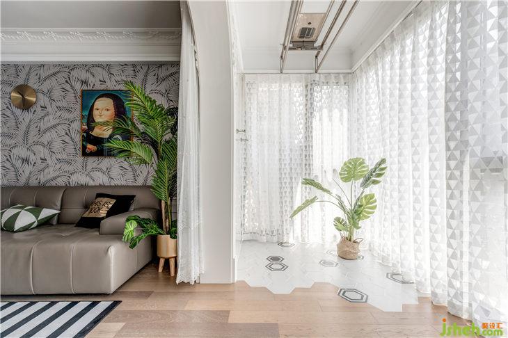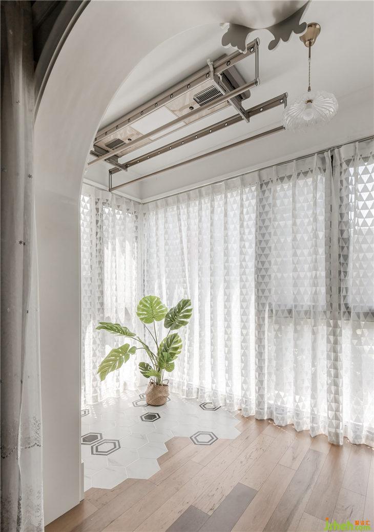 透過心型大門套,地板直鋪到落地窗下口,這邊也自然過渡了跟廚房一樣的六角磚,頂上是生活晾曬區(qū)域,透過幾何半透的落地紗簾,綠植在這里也可以吸收溫暖的陽光。