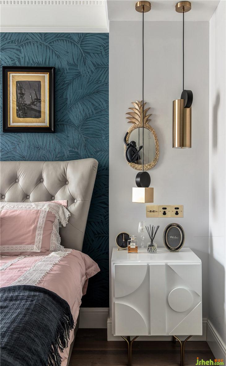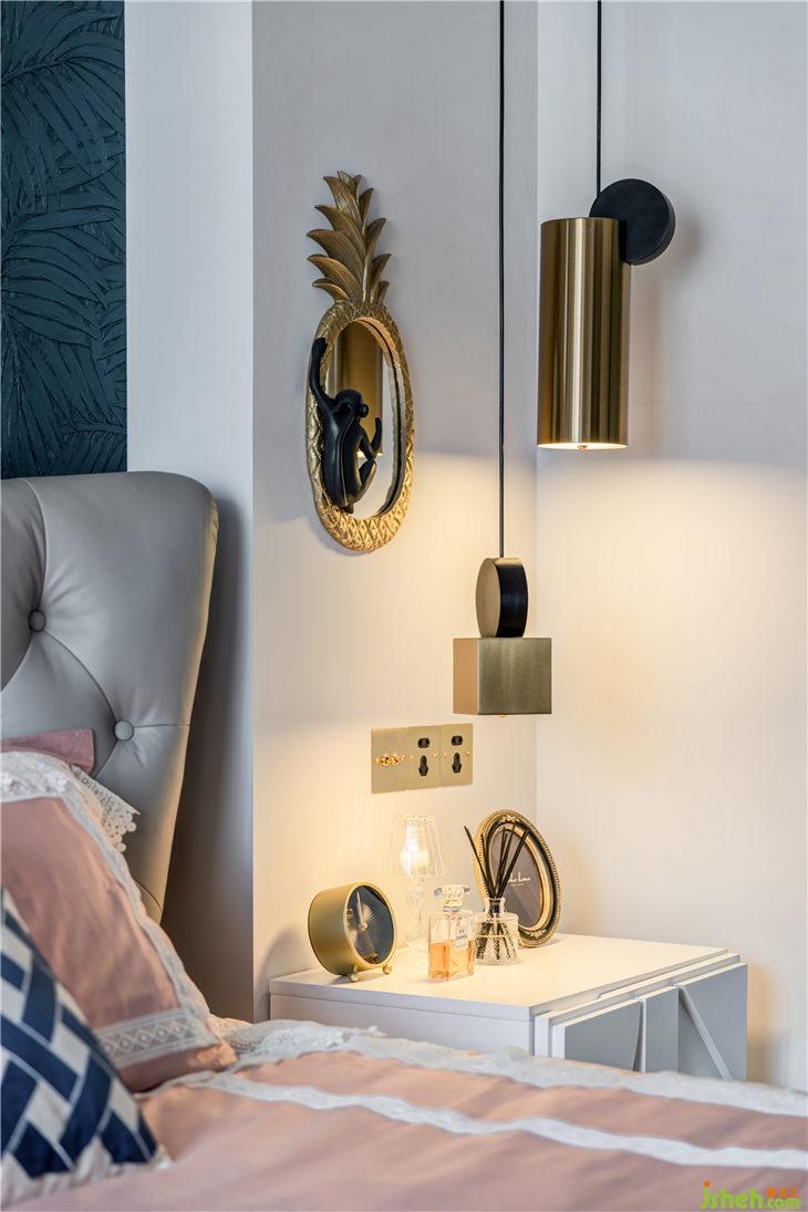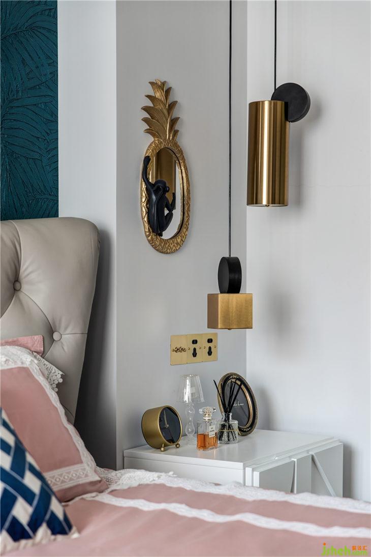 錯落不一的吊燈,結(jié)合墻壁上菠蘿猴子造型的裝飾鏡,幾何圖案的白色床頭柜,現(xiàn)代混搭的氣氛悠然自得。