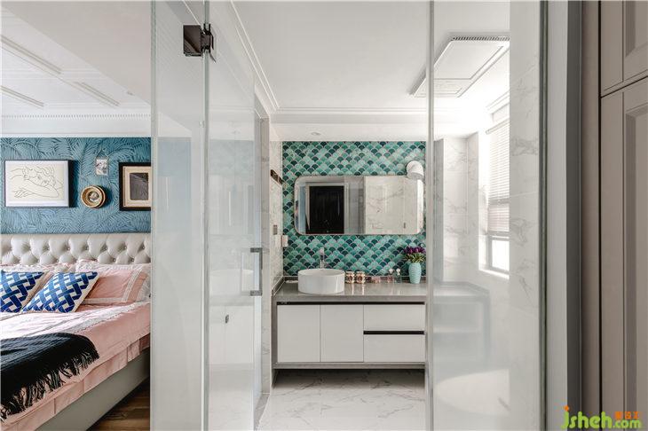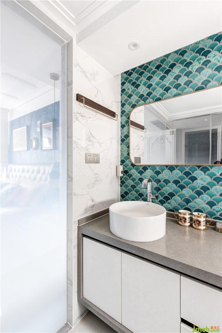 扇形馬賽克冰裂紋瓷磚是這個空間的亮點,這邊特別選用了灰色的瓷縫,讓每個扇型都融合成一個整體,這也與廚房墻磚的搭配有異曲同工之妙,上下燈帶補充了空間的精致氛圍感,大面黃銅框裝飾鏡,增加了空間視覺,又很好的滿足了女業(yè)主的需求。