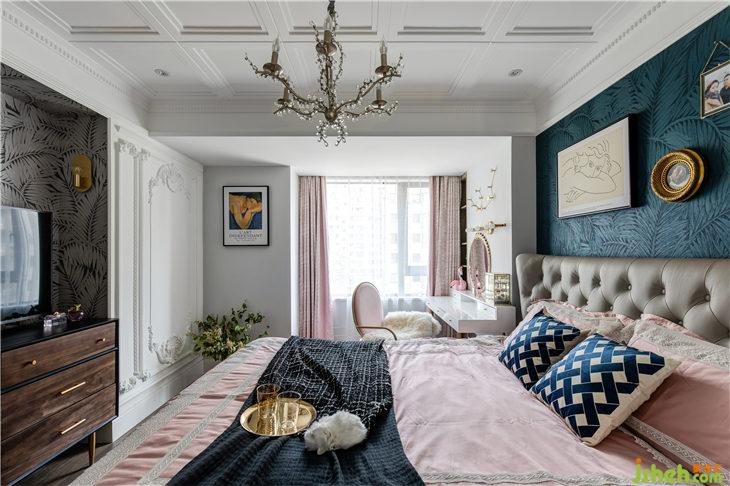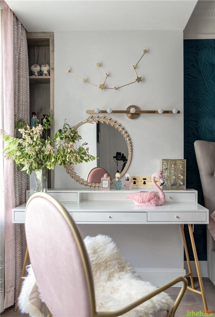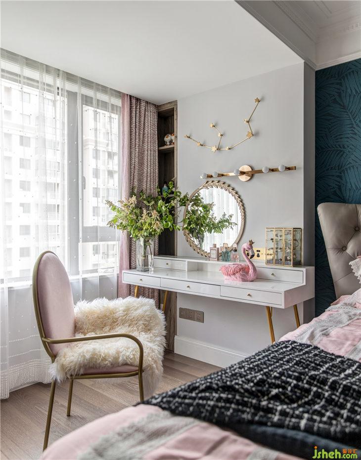 妝臺是我們女業(yè)主使用頻率最高的地方,我們選配了1.4m雙層收納妝臺。墻角內(nèi)凹的空間,我們也利用起來做壁龕,可以給業(yè)主做美容產(chǎn)品的收納空間,虎皮紋的粉色窗簾+波點裝漸變的紗簾,粉色絨布高背化妝椅,絨毛坐墊舒適溫暖的柔化了金屬框的硬朗,除了美,還是美。