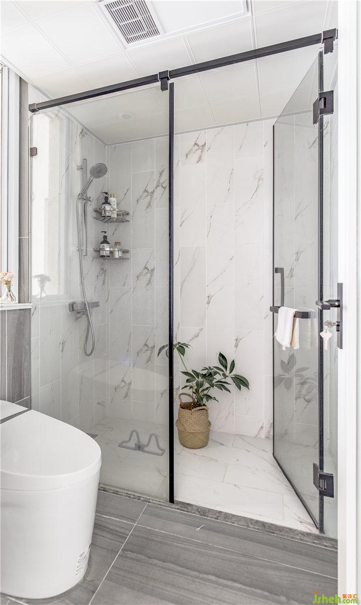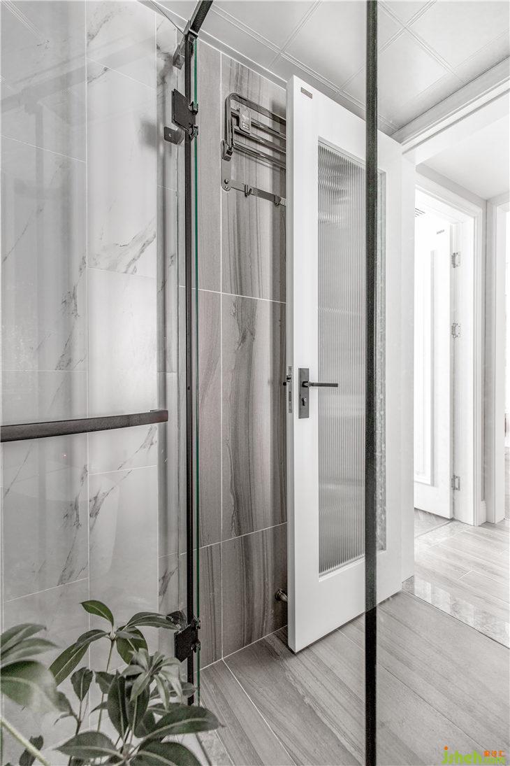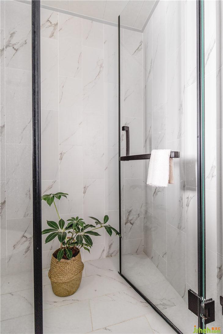衛(wèi)生間運(yùn)用兩種瓷磚的大面積鋪貼來分割空間,淋浴間用瓷磚豎鋪工字磚貼法,順延到地面,干凈整體。