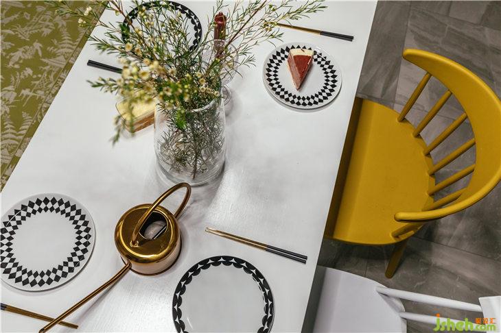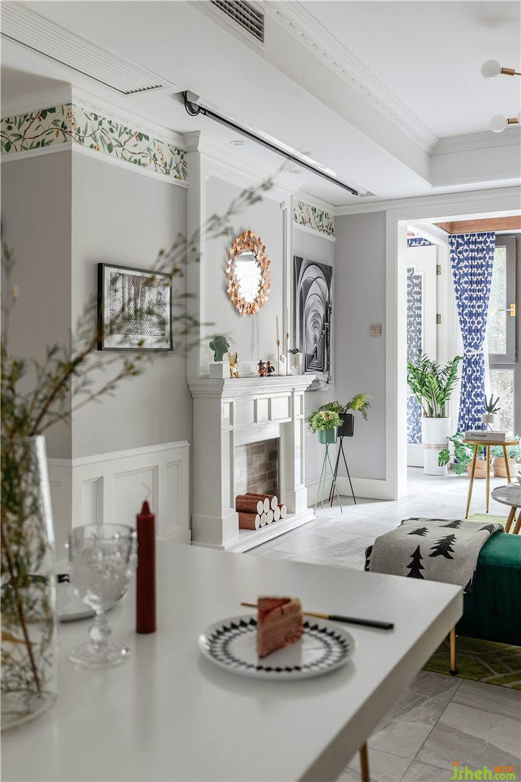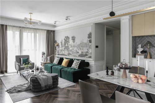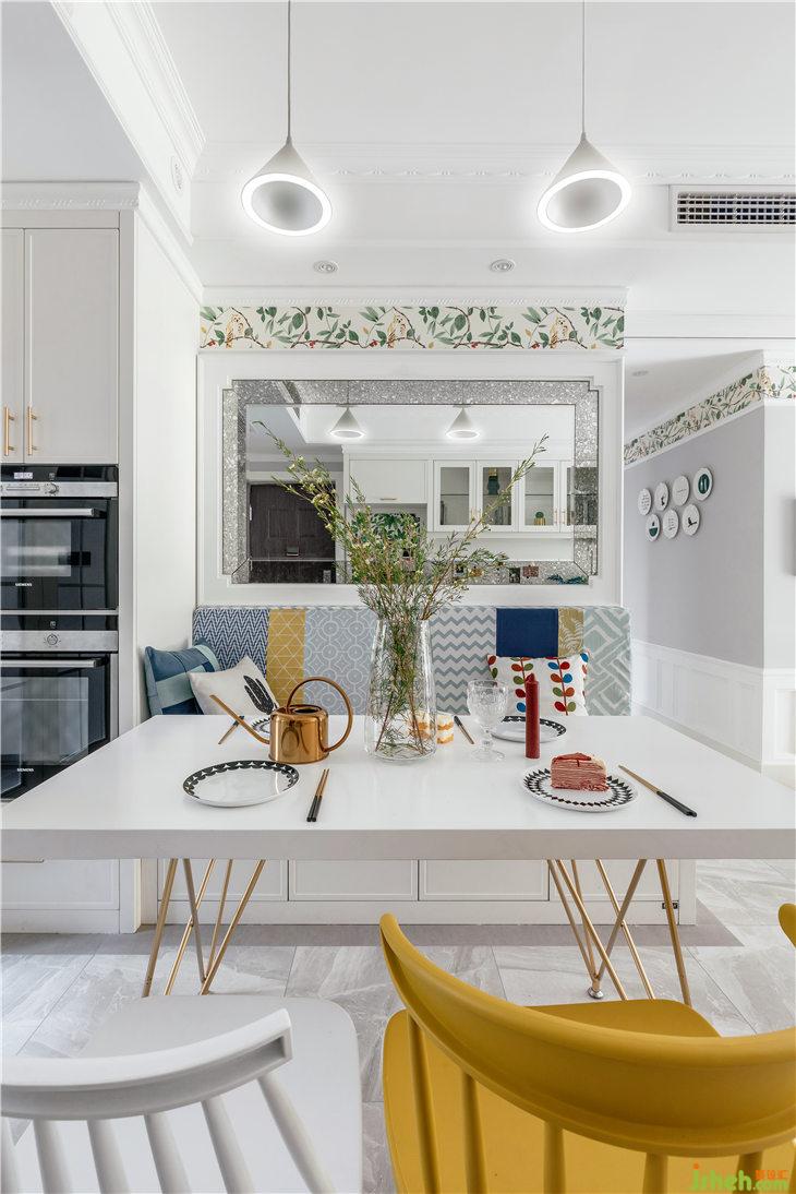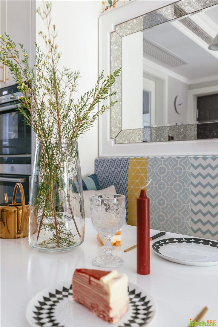 打開入戶門,是我們的餐廳區(qū),我們將餐廳背景墻當做入戶背景,空間稍顯局促,我們在空間布局上,設計了固定的卡座,卡座上方一方鏡面,復古鏡收邊修飾,目的是拓展視覺空間與層次。