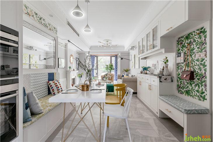 餐廳背景與廚房門之間,設計了一個電器高柜,將微波爐和烤箱放在了餐桌旁,上方的柜子也兼具餐邊儲物柜。