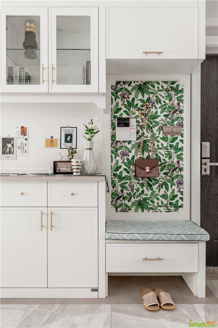 入戶右手邊,我們設計定制了一組鞋柜和酒柜組合,鞋柜卡座背后點綴花卉壁紙,下方挑空處理,方便放置常用的鞋子