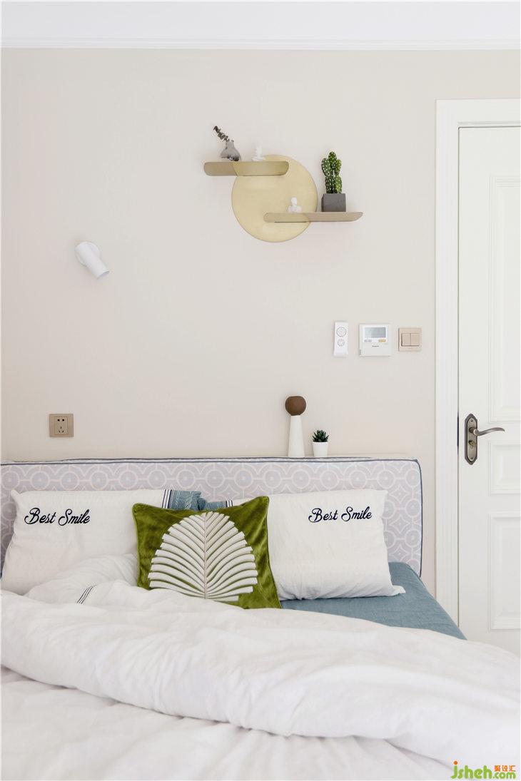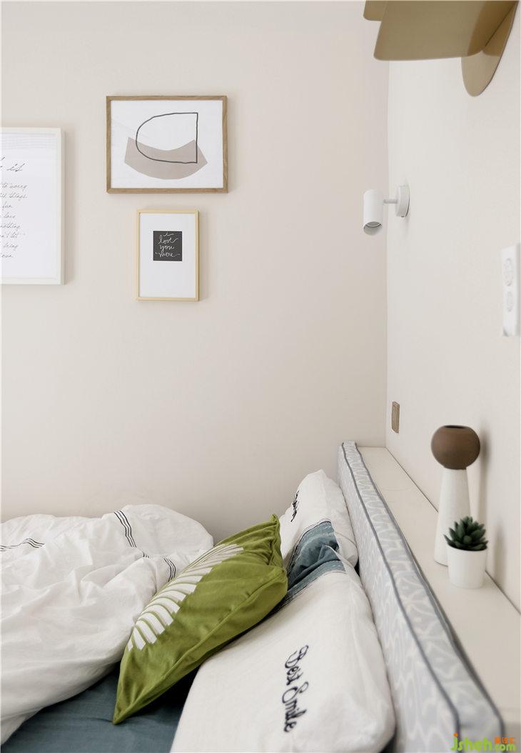次臥空間不大,與南陽臺相同,采光充裕。放置了一米五的床,定制了一個窄衣柜,就已經(jīng)充滿了房間;因此我們墻面選用了清新淡雅的白鷺色乳膠漆,搭配暴風雨灰色系床品,點綴雪松綠抱枕,讓空間盡量的明亮清爽,單配精選的墻面掛飾和吊扇燈,簡約而又富有生活趣味。