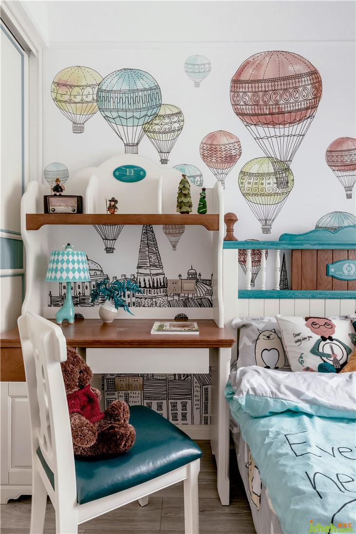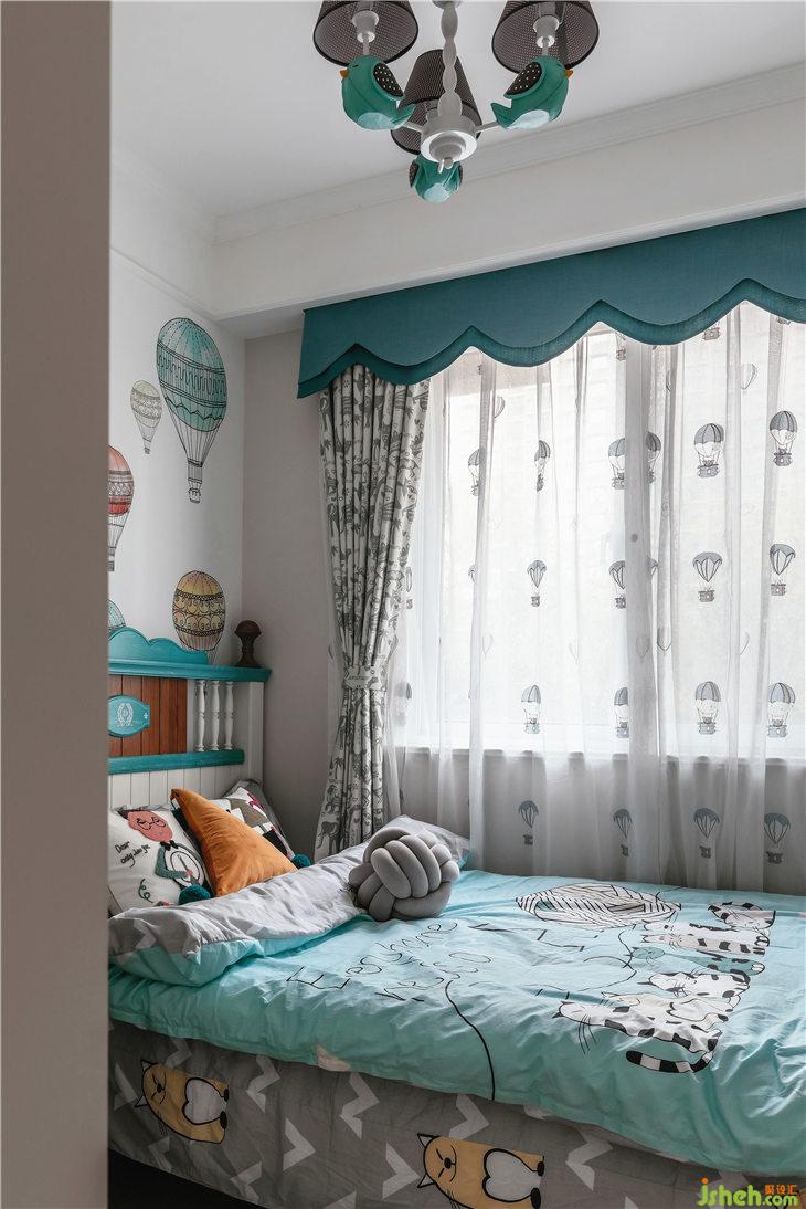 業(yè)主家有個四歲的小男孩,兒童房我們選配了環(huán)保等級很高的美式實木家具,淺孔雀藍配搭玳瑁色原木家具,氣球背景墻布的沙漠紅與成品家具顏色相互呼應,窗簾的幔頭我們也選配主打淺孔雀藍,比斯開灣藍色收邊體現(xiàn)精致感,貓頭鷹燈具與壁燈造型相映成輝,紗簾上的小氣球,每個細節(jié)都體現(xiàn)了設計師的用心之處。