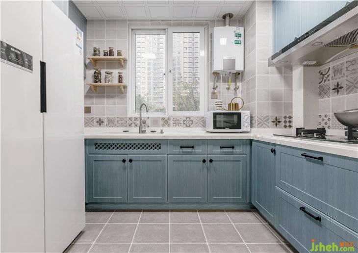 孔雀藍的柜門是專門定制的,把手特意選了亮金色,凸現(xiàn)氣質(zhì)。