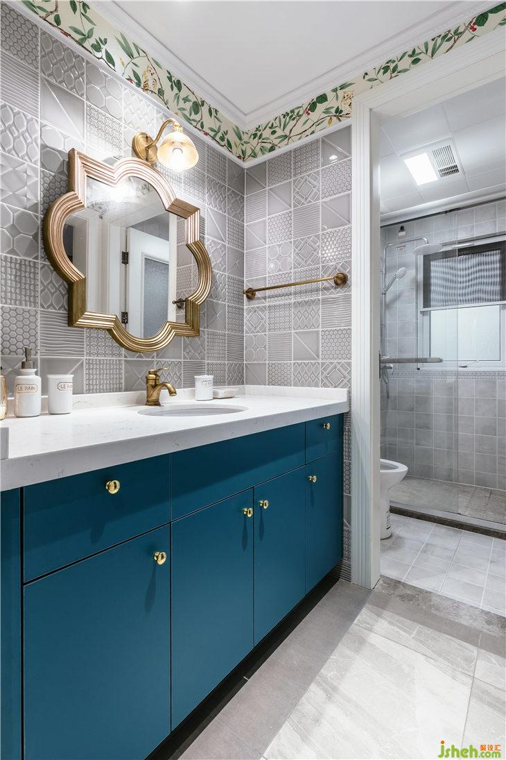 廚房跟餐廳相連,雙移門內(nèi)退到墻后,地面不做地軌,讓空間過度自然,廚柜選用了灰藍色木飾面門板,復古銅色把手,灰橙色花磚作為腰線圍繞臺面一周,灶臺面花磚作為主背景提升整體美式精致感,廚房不但是家居生活最重要的功能區(qū),也是生活儀式感提升的主體空間。