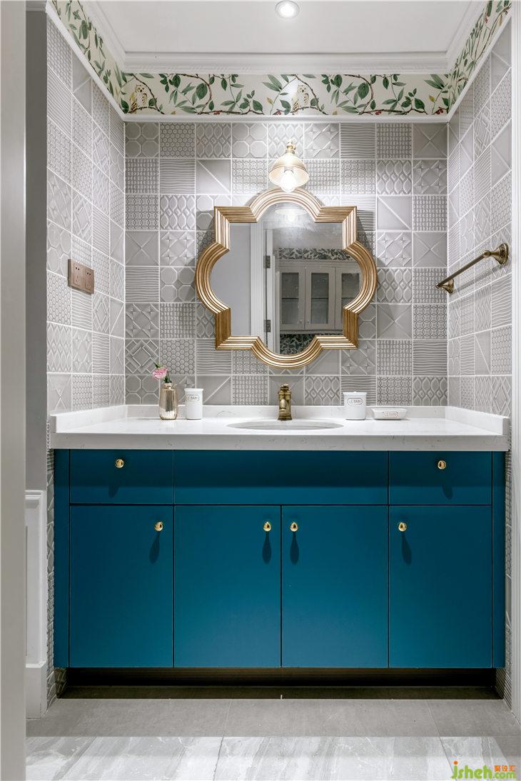 三個層次的分隔,一直順延到干區(qū),中間段用美式小浮雕磚做干區(qū)主背景維和式的鋪貼,古銅色壁燈、龍頭、掛件,小細節(jié)中體現(xiàn)美式復古韻味,花型裝飾鏡作為中心主背景,提升整體精致度。