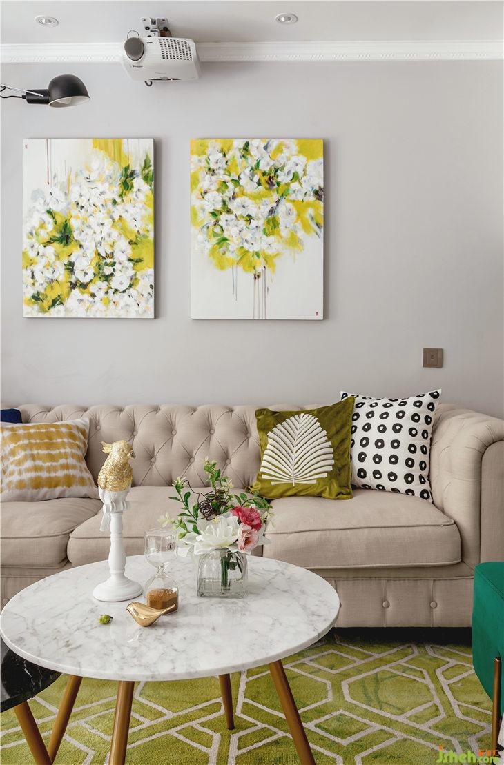 沙發(fā)背景墻,定制了一組芹菜綠花卉掛畫,地面用比背景畫深一個色度的菠菜綠沉淀了一下,搭配古典綠的長踏,整體色調與陽臺外的綠意盎然交相輝映。