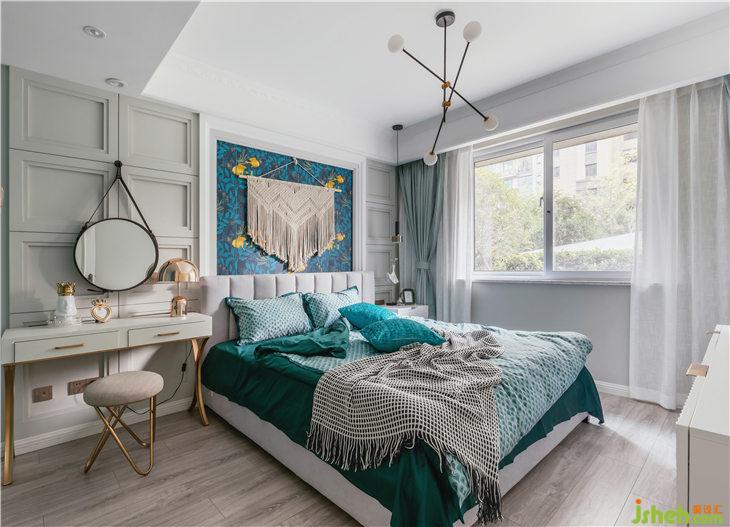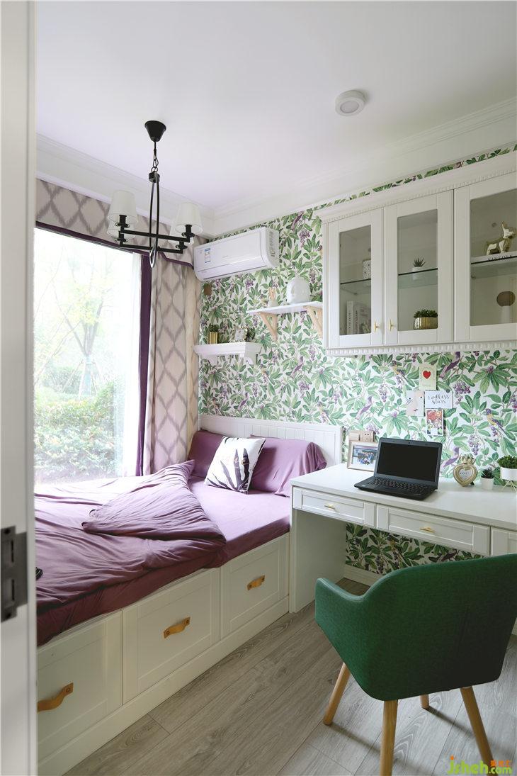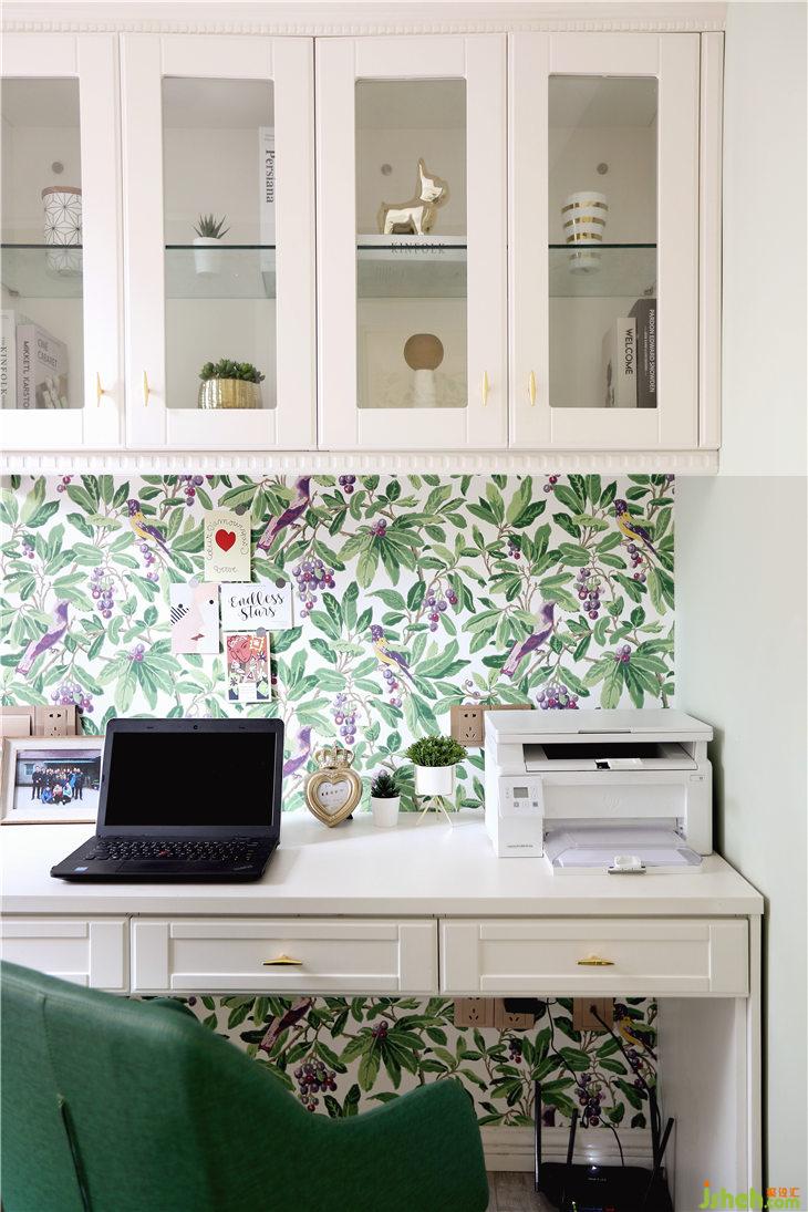書房我們選用抹茶綠色系花鳥壁紙,壁紙中還局部點(diǎn)綴了絳紫色小鳥,所以我們的窗簾和床品搭配了淺一個(gè)度的葡萄汁色,大面積用淺灰綠色乳膠漆,再搭配一個(gè)墨綠色的書桌座椅,整體色彩搭配付有飽和度卻不顯得溢滿,依然很好的詮釋了美式的清新沁人。