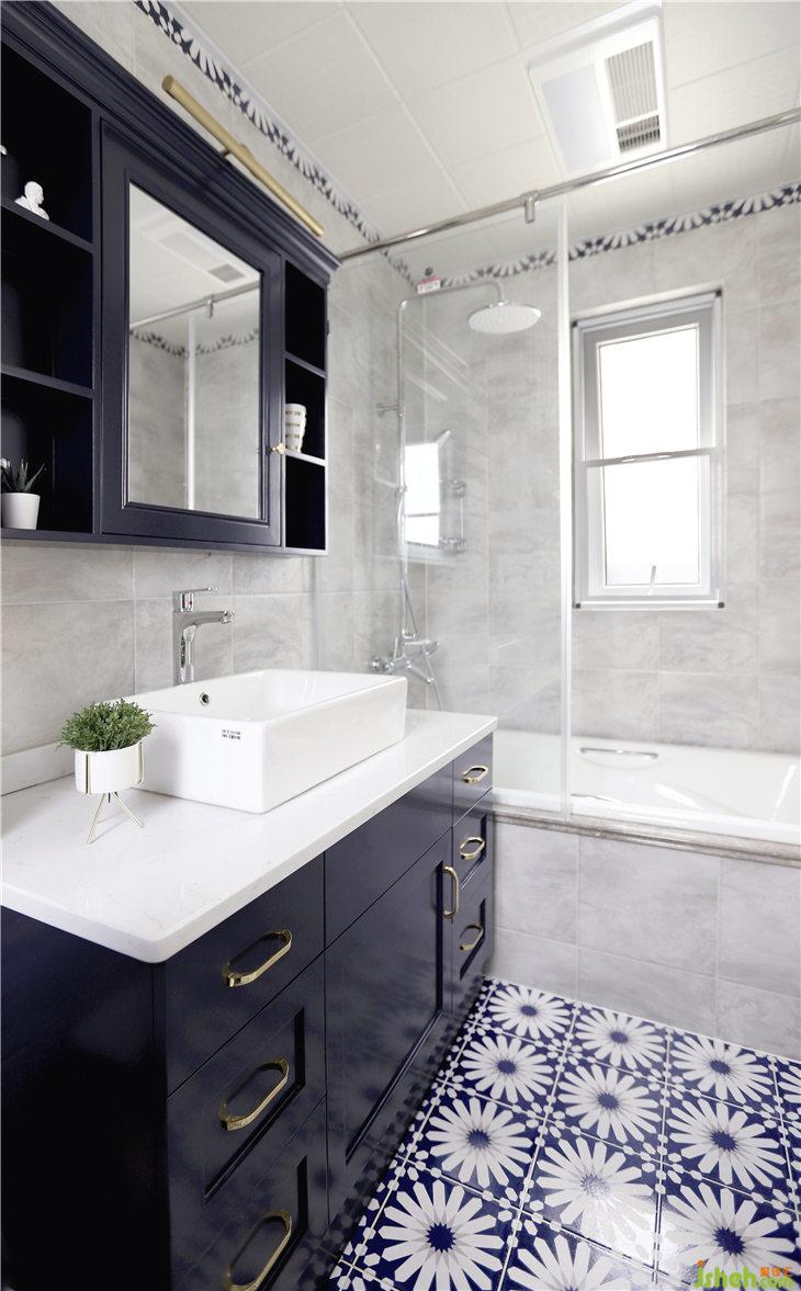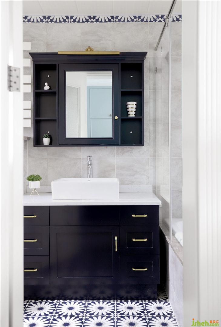 主衛(wèi)主打尊貴氣質(zhì)的藏藍(lán)色,淺灰色的復(fù)古墻磚搭配落地烤漆臺(tái)盆柜,結(jié)合美式儲(chǔ)藏鏡柜,地面搭配美式深藍(lán)花磚,色調(diào)中氤氳著冷冽的氣質(zhì),柔和的觸感彰顯了空間優(yōu)雅本色。