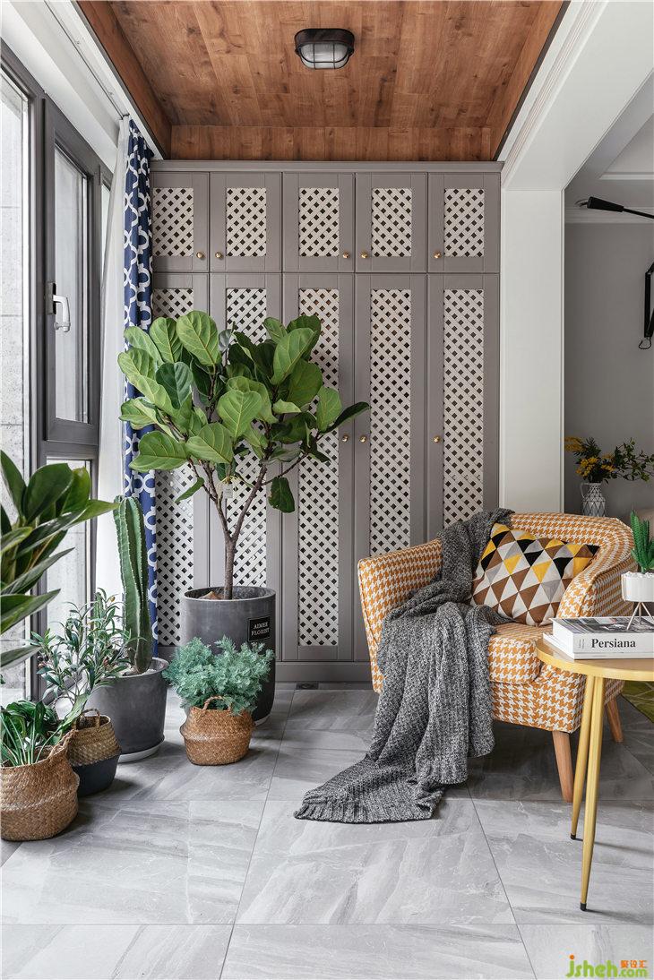 我們將地板鋪在的陽臺(tái)吊頂,將更多的復(fù)古木色融到空間中,增添休閑典雅的氛圍。