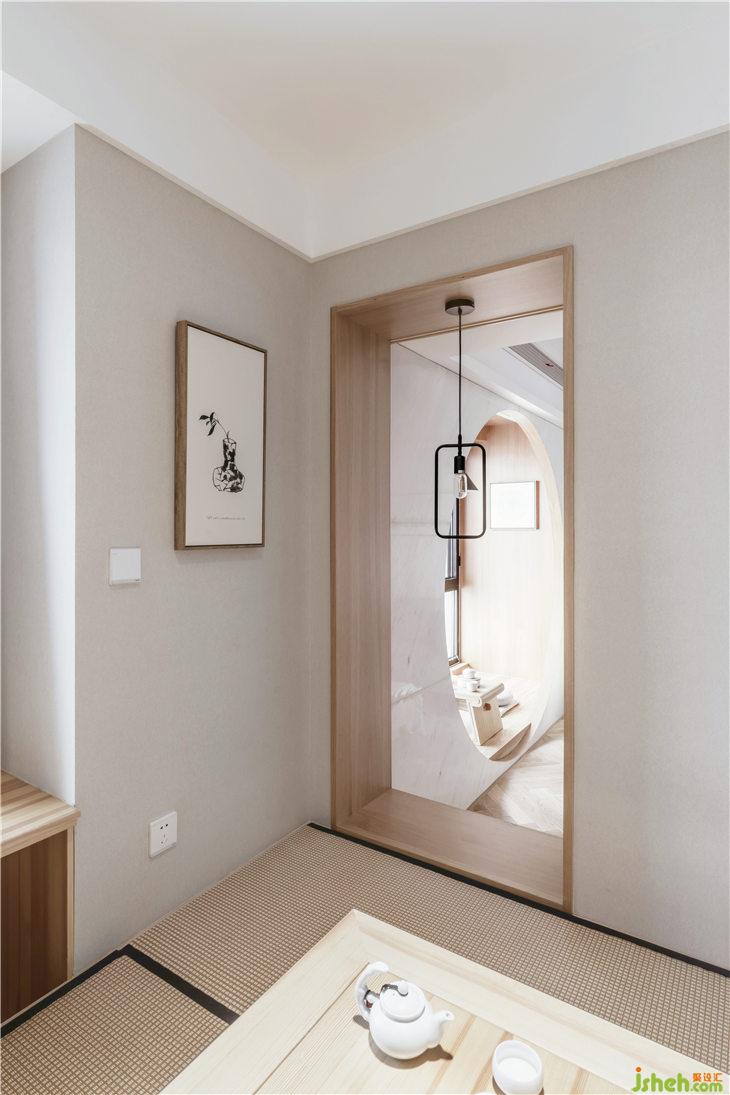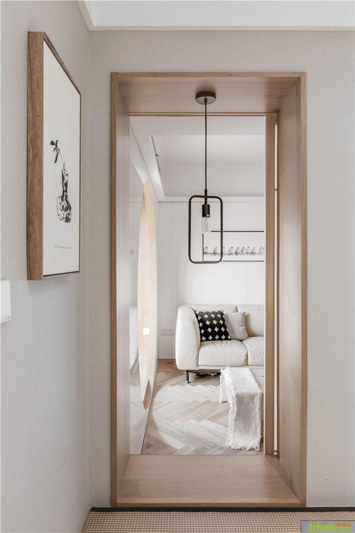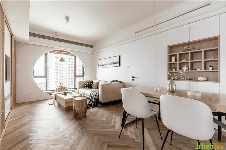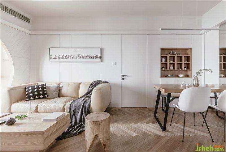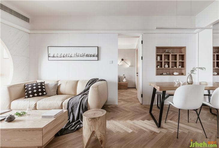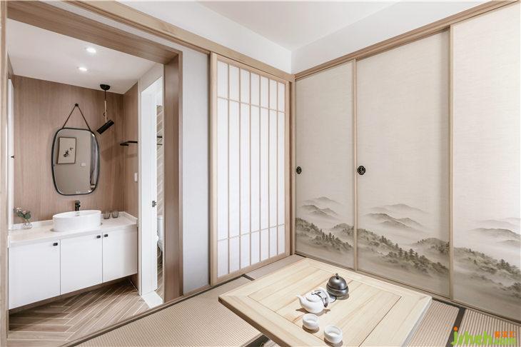 客廳地面鋪設人字地板,門套以及移門皆使用和室風格的木質材料,沙發(fā)背景墻白色護墻,豎向抽縫,與主臥門材質統(tǒng)一,融為一體;客廳陽臺飄窗,是最佳的觀景空間,我們將飄窗打造為一個休閑空間,讓這里成為品茶閱讀的休閑觀景臺。