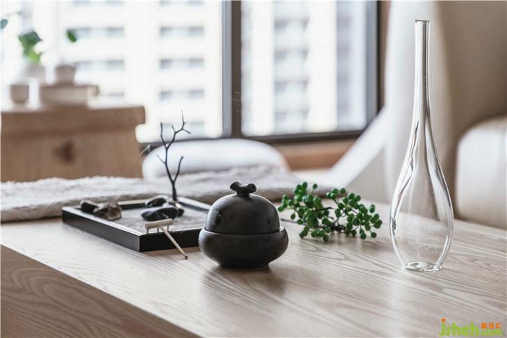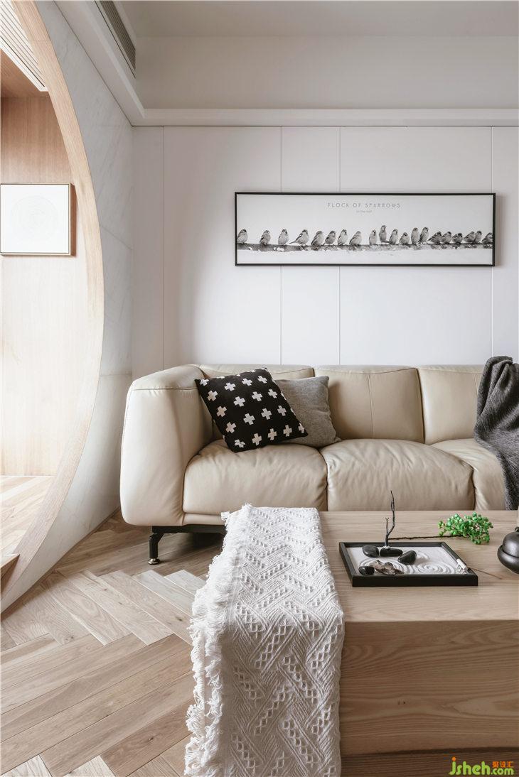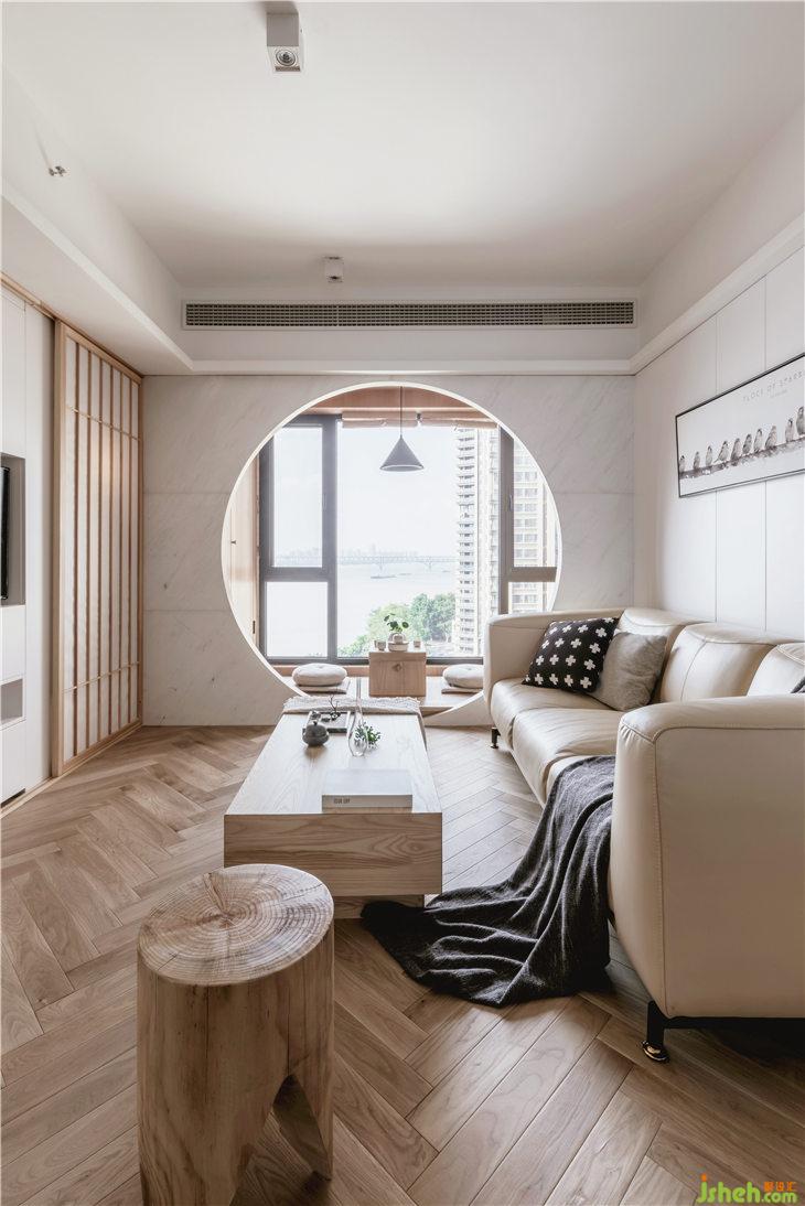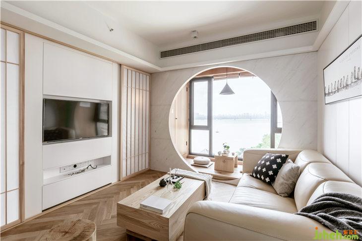 在客廳的飄窗設計了圓拱造型,形成了圓形的取景框,營造一種富有詩意的畫面感。整個空間的木色飾面,使用KD板材料,更加細膩和整體。