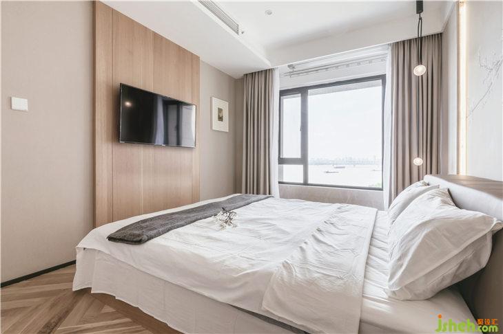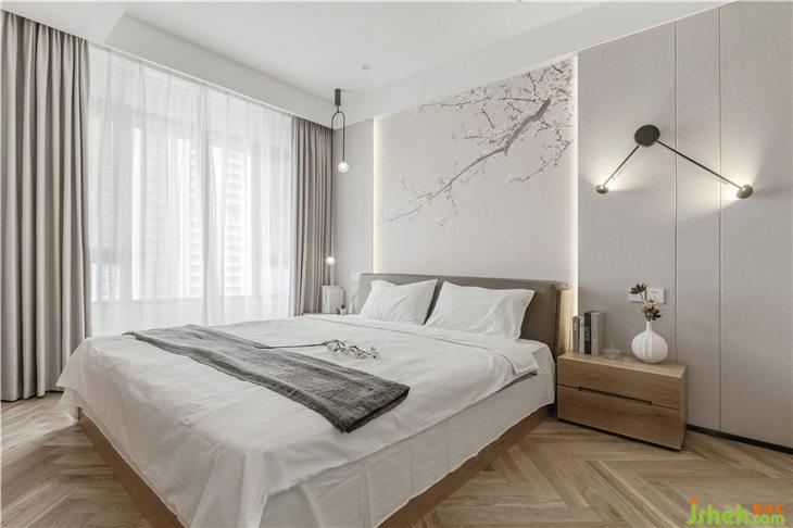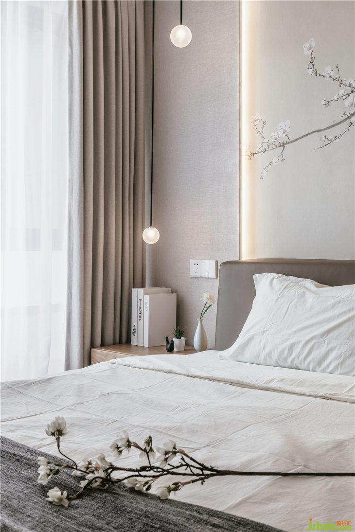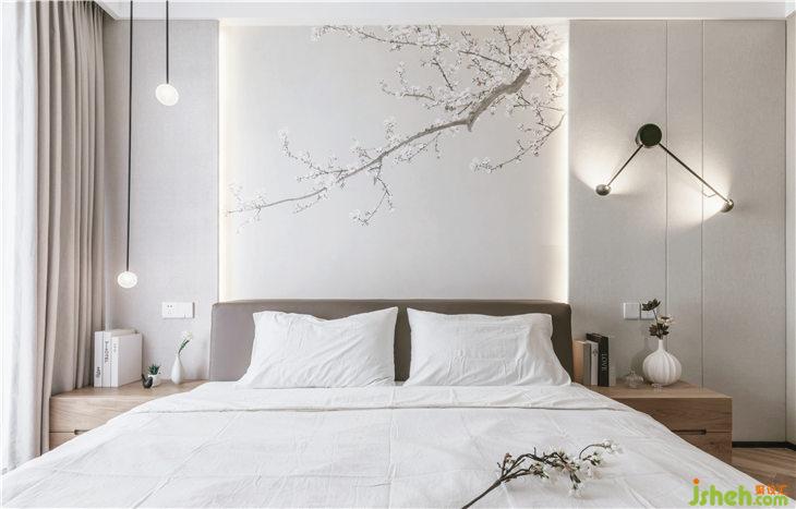 主臥地面延續(xù)客廳的人字地板鋪貼,背景墻使用硬包并抽豎縫,與客餐廳背景墻的抽縫相呼應(yīng);兩個(gè)床頭柜上方,選用壁燈和吊燈的不對(duì)稱設(shè)計(jì),使得空間更加活躍靈動(dòng),床背景中間點(diǎn)綴梅花枝葉壁畫,一幅東方禪意之美應(yīng)運(yùn)而生,主臥右側(cè)內(nèi)藏了一個(gè)完整的衣帽間,延用了日式隔斷移門無(wú)地軌的設(shè)計(jì),這幾處門的設(shè)計(jì)又恰到好處的詮釋了我們的風(fēng)格定位。