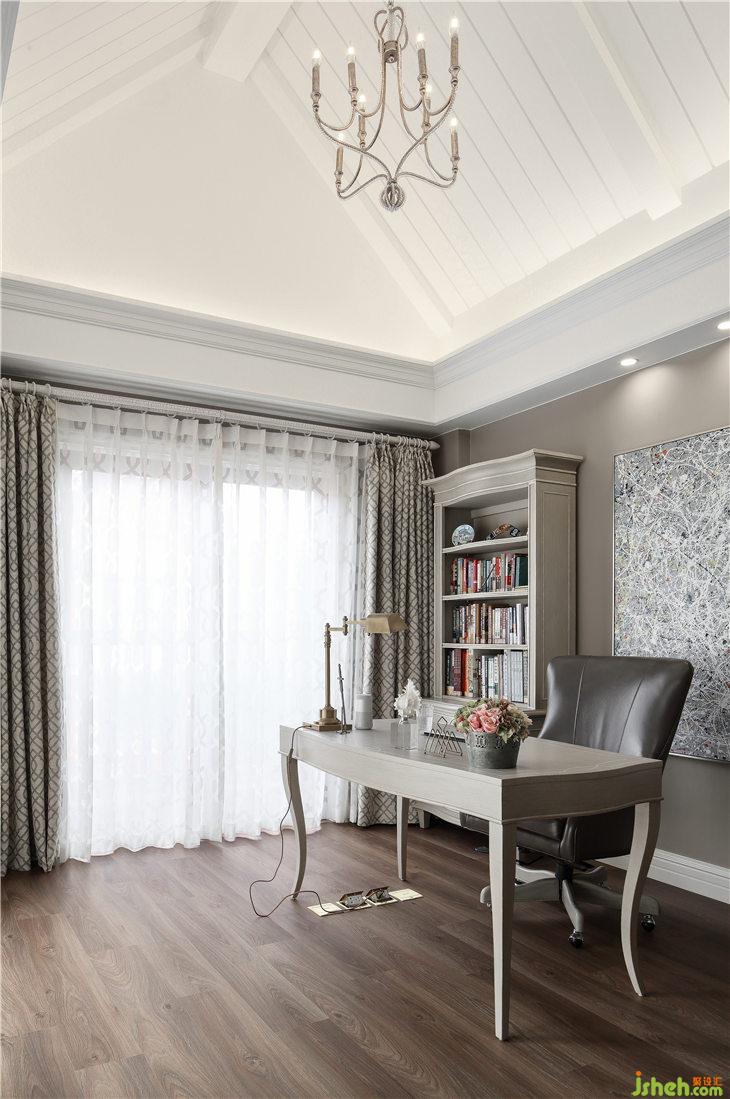 書房頂部保留原始建筑造型的尖頂,石膏板線條抽縫造型讓頂部細(xì)節(jié)層次豐富,墻面的淺米灰色乳膠漆寧靜淡雅,與家具、軟裝的搭配也是相得益彰。